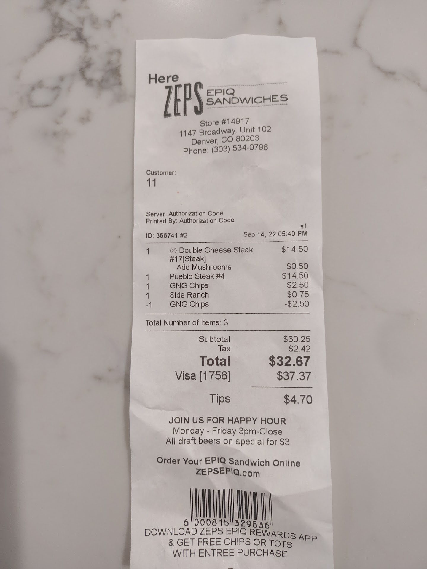 When he agreed the tip showed up. Somehow the tip had increased 2.70 cents. Honestly it feels like the gentleman increased it himself. When I brought it up he ignored me. I brought it up again and he said there's nothing he could do. As he refunded the chips on the open transaction. Ah I see I didn't ask for a receipt and you add extra tip. Then you got caught. I expect a refund for the $2.70 and a call from the manager about this situation. I will for sure not be ordering anymore lunches from zeps at any more work functions.