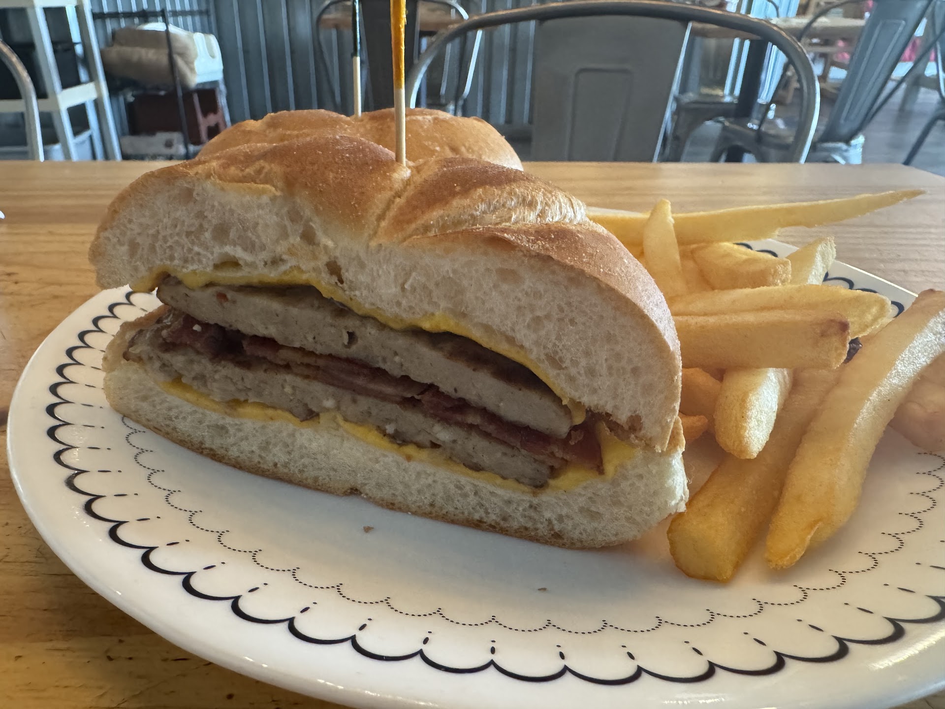We stuck with breakfast and had the 1+1+1+1 (Frenchtoast, pancake, egg and sausage - instead of the sausage, they accommodated an egg swap without any hassle), the chocolate chip pancakes and a side of bacon, and the Spicey Omelet (Chicken sausage, jalapenos, roasted peppers and mozzarella cheese) with some whole wheat toast.