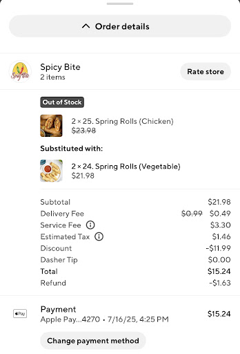 very poor customer service. the person speaking to me hung up because he was talking to someone else in store. i ordered on door dash for 25 chicken spring rolls and got 13 vegetable spring rolls. i tried to explain that if it was the veggie spring rolls being sent that i wanted to cancel the order and they hung up again. now to my door i have received 13 spring vegetable...