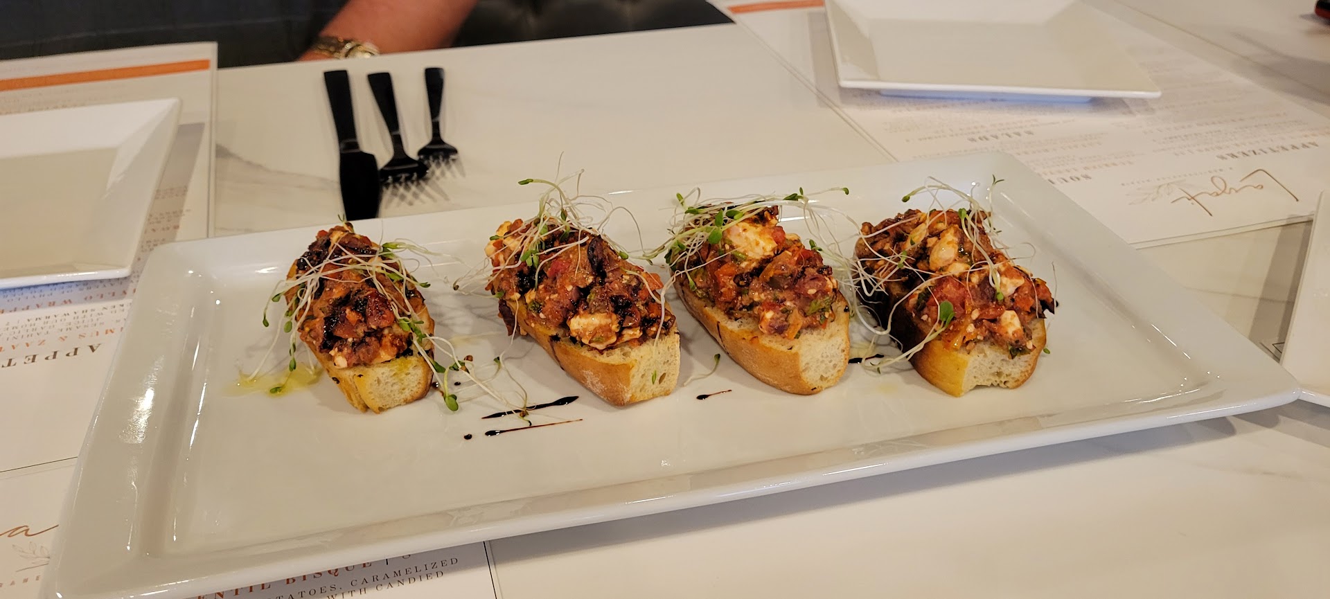 The restaurant is cute inside and I had so much hope for it. We ordered the bruschetta appetizer and it was nicely done. Tried the lentil soup and was surprised at how carrot-y it was. The beet salad was lovely and the dressing was perfect. The Greek salad was nice but was delivered only after the other salad and soup were almost gone. Had to ask the waitress about it. My brother in law ordered the chicken and it was tasty but served with a succotash and the feta cheese pudding. He said the different ingredients in the succorash were all cooked differently. The squash was hard albut the corn was good. He kept trying to find a taste to the feta pudding which was more like a bread pudding, just almost flavorless. The ribeye was cooked well but was coffee rubbed and the coffee was actually like a coating. It was served with green beans and 5 sliced potato pieces. Although it was cooked just as my husband asked, for a ribeye it was tough and a little grisly. My sister loved the pork chop which was flavored well and served with fingerling potatoes and green beans. I had the short rib served with mash and carrots. The carrots were a little overcooked hut the mash was well flavored. The short rib was delicious, tende4, and so very good. We also tried the egg nog creme brulee. It was good. The waitress didn't seem very knowledgeable about some things on the menu but willing to ask. She also was not very quick to ensure we did not have empty glasses. And we were subjected to their live music. It was very loud. We asked if they could turn it down a little and he seemed to turn it up. I'm sure it might have been enjoyable if not blasted at us. All in all. It was ok. We will probably try again but we were just a little...