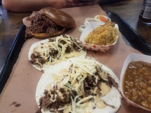 Food: we tried the brisket taco, tot casserole, baked beans, and chopped brisket sandwich. We loved it. Their sauce was good. Portion for price is filling. (I wish they had brisket nachos!). We have also tried their chicken enchiladas and the smoke flavor of the chicken was amazing! We recently tried the brisket nachos with smoked queso, bbq sauce and Chipotle sauce and it was good.