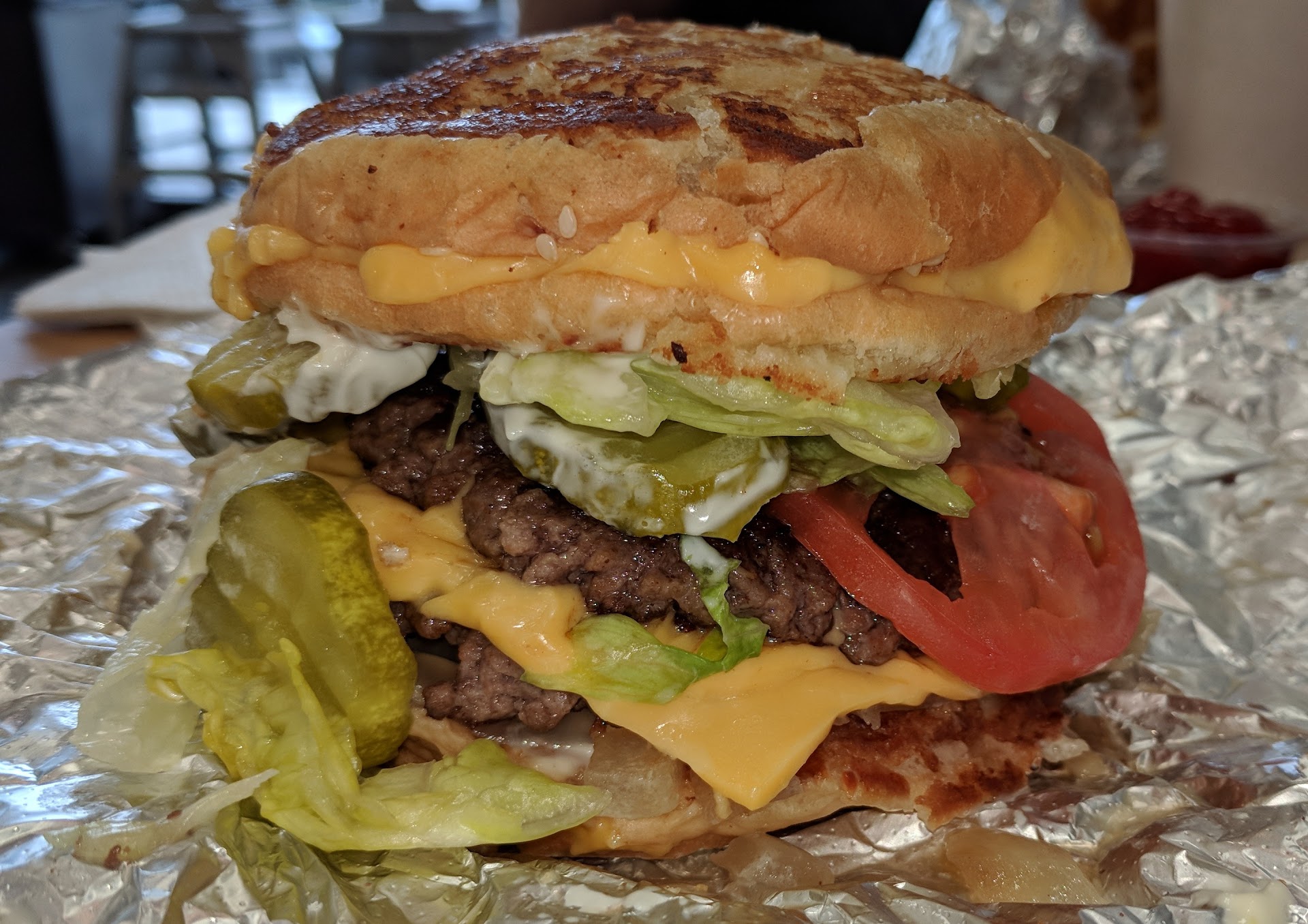 When I unpacked my order, the "Double Grilled Cheeseburger" didn't quite fit in the foil they use to wrap up their sandwiches. It was a beast and very messy to eat, but that's not a complaint. After ordering the "Double" this go around, I believe the two extra pieces of bread from the two grilled cheese sandwiches serving as the burger bun was more bread than necessary and if I order from the 'secret menu' in the future, I'd just order two burger patties inside one grilled cheese sandwich. While this burger was tasty, it wasn't the best burger I've ever ordered at Five Guys. The reason I deducted one star was not because of the extra bread that I've already commented on, it was due to the grilled onions not being left on the grill long enough for them to actually start to caramelize. They were rushed and placed on the burger way too soon, and therefore the loss...