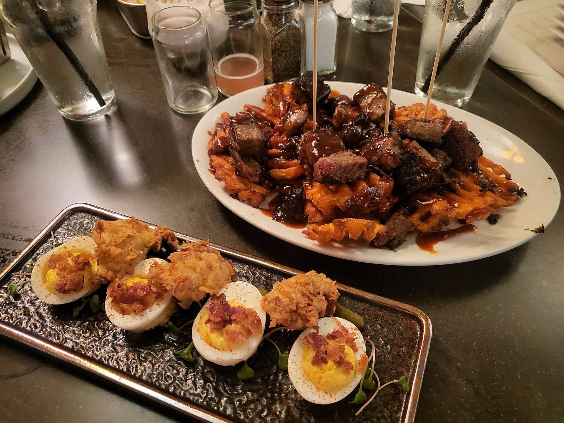 Read moreThis was an unfortunate end of our evening. While in town for an event my husband and I thought a popular local spot was just the ticket...we were wrong. The hostesses were quick to get us a spot at a high top table near the bar. We were seated at the coldest table outside of Antarctica, we asked to just be seated outside (it was warmer), we were told, nope...sorry. Okay, we made the best of it. The waiter/bartender with the man bun was quick to bring us some water then left us for about 15 minutes to ponder our drink selections. Once he came back we gave drink and food orders (we had plenty of time to decide). Drinks came out pretty quick, then service went downhill. My husband ordered a steak (medium) and I asked for the chicken tenders. It took well over 30 minutes for food to come, in the meantime I had asked for more water 2x before it was brought to us. Once the food arrived, it looked great and admittedly my husbands steak was okay, cooked well and my chicken looked great...but then I tasted it. It tasted like deep fried dirt. GROSS. Now most restaurants will notice when a customer isn’t eating or will at least stop by and check in how the food was received, but not this joint! Well over 45 minutes went by, no one ever checked on us until it was time to bring the check. (Mind you we never saw our waiter again). I asked for a manager because I certainly wasn’t paying for food that was non-edible and thought they might like to know how customers were being ignored. Nope, they never came. We paid our bill and left. So I figured since the management wasn’t interested in my feedback, perhaps putting it out there for others to read my help inform some decisions of future diners....we will certainly...