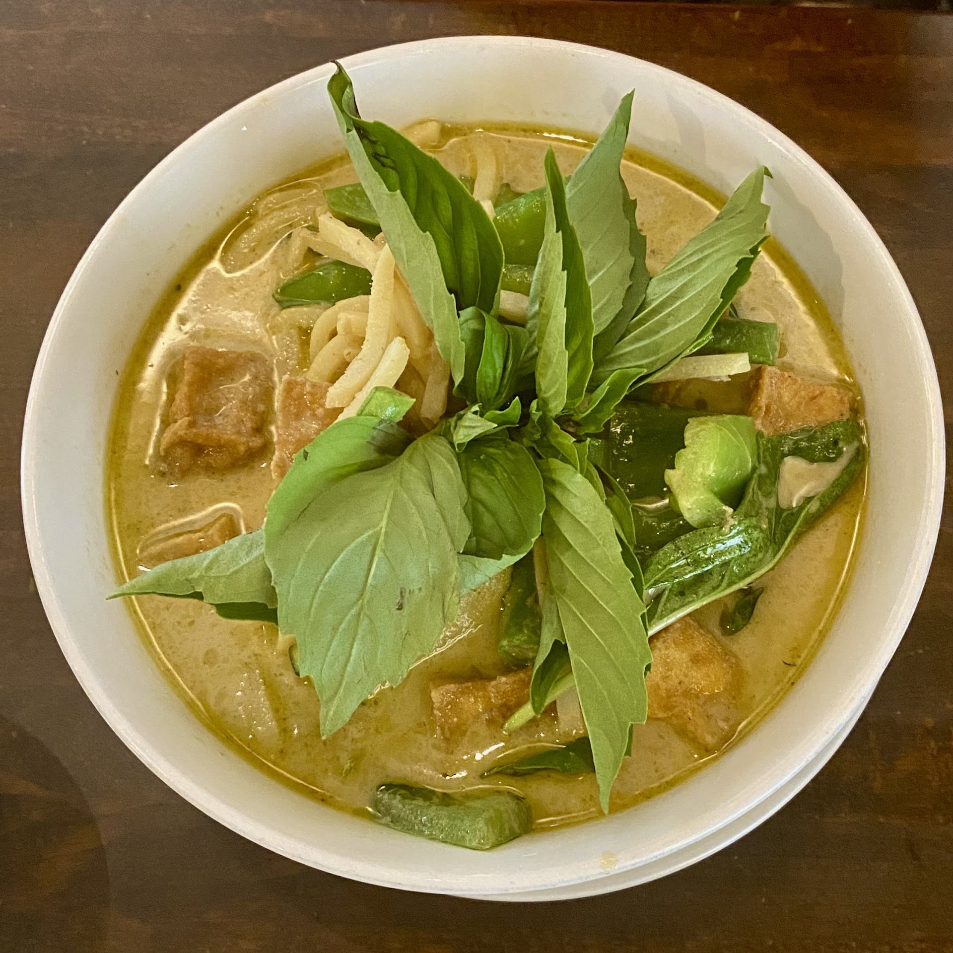 Green Curry with Fried Tofu: Spicy, as one could expect from a green curry. Tofu has a wonderful texture to it that makes me want to try it again. Plenty of Thai basil and other spices made this dish aromatic and tasteful. Comes with a small bowl of rice.