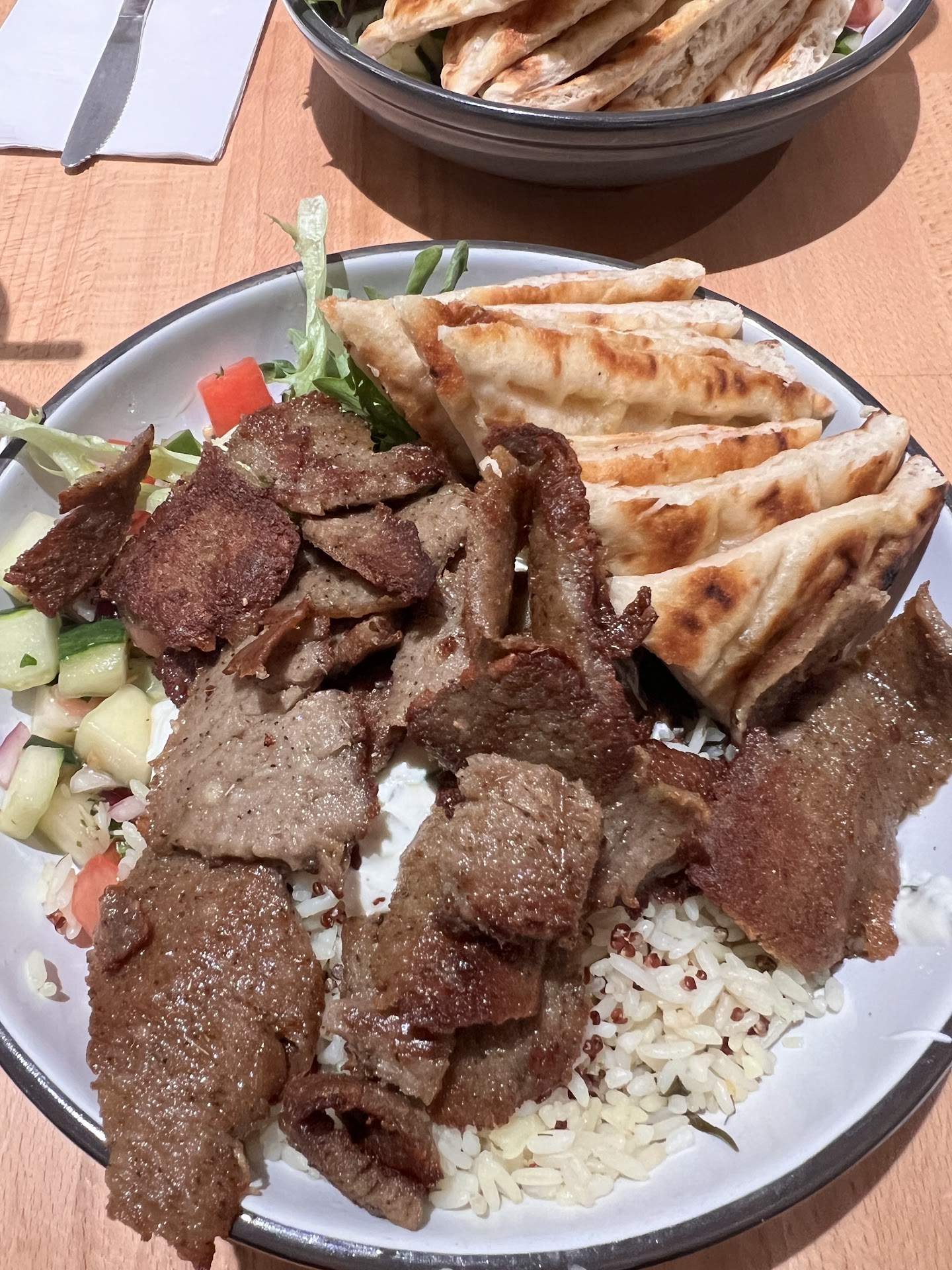 My husband and I came back here on our third visit, and I gotta say that it was disappointing. I ordered the same bowl, but this time the meat was scarce and sad looking. They seemed to have given me the scraps off the meat. They were thinner slices and more charred. I was shocked by the presentation. My cucumbers and tomatoes were chopped into chunks, barely seasoned, and hidden under the pita bread. I asked for 2 sauces but they only gave me one. I asked the waitress if I didn’t order the tzatziki and she said she could bring it. It came in a tiny cup, which I emptied out into my bowl. Well, the tzatziki sauce was $1 extra! This is poor business practice because the hummus that I got was too scarce. The bowl is dry so you need some more sauce or vinegar to balance the texture. But they give you very little hummus, which you have to ask for more sauce, but they charge you extra? That seems like a trap to me. Anyways, this time around was way worse than the first time. I’m very skeptical about the lack of consistency of this place. ———————————————————————— Parking was somewhat difficult to find when I pulled up to the restaurant. All the spaces were filled so I had to turn back around and park by the Inn behind it. When we walked in, we got seated right away. It was pretty packed in there so it does get very noisy. My husband and I both ordered the customized bowls. I got the lamb signature and he got the falafel. Both were delicious and tender. I was very impressed, considering it’s rare to find that in this area. I got mine with mixed greens, rice with quinoa, and the cucumber with tomatoes salad. I will say that the cucumber and tomatoes salad could be improved. It very much lacked flavor. A little vinegar and more olive oil with a squeeze of lemon would’ve served better in taste. It was very bland and the tomatoes were a bit mushy. However, the highlight was the pita bread. You can tell that they’re freshly baked because of the soft, billowy texture of the pita and the warmth when you bite into it. Service was prompt, but you may have to wait longer when they’re busy. They asked if we wanted to order desserts but both of us were very full from the entrees that we passed. Next time, I would like to try their baklava. I’ve been to many Greek restaurants outside of Central PA and this is pretty good compared to the other places I’ve been to in larger cities. So glad we checked...