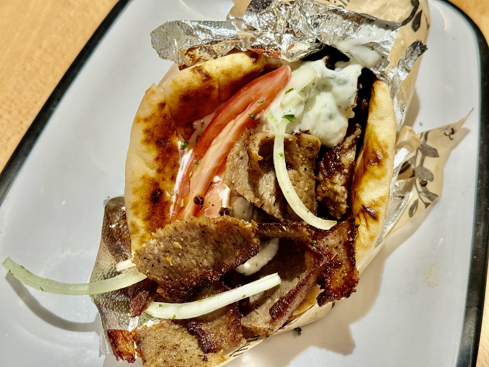 Then came the fresh, crisp onions and the plump, sun-ripened tomatoes, each one delivering a vibrant pop of brightness that sent my soul soaring. And the pita—oh, the pita. Warm, pillowy, griddle-kissed perfection. Soft yet chewy, steaming with anticipation, it embraced the gyro like a lover, holding it together in a passionate embrace of flavor and texture.