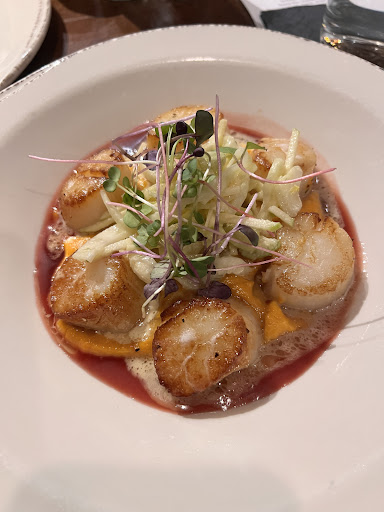 My husband and I dined here for dinner. This was our first time dining here and I chose it for our date night because it was our first time in a long time since we got to have dinner at a nicer restaurant around here. Now of course, this is no fine dining restaurant, but the prices are expensive enough to make one question if it should be. I read positive reviews about this place so I was curious to see for myself. Well, it seems that some things are overlooked by the customers and the managers for that matter. Iâll start with the good. The hostess and our server were pleasant and friendly. Our server Kate had a positive attitude and didnât rush us. However, the one critique I have to point out is when my husband ordered a beer from the âbottle beerâ list. Well, she brought out a can, and it was already opened. No glass was offered to pour the beer into. Now, having worked at restaurants, we both thought that was strange. Almost any restaurant Iâve been to would bring it with a glass or ask you. However, my husband is very easy going and doesnât like to be an inconvenience to anybody, so he just drank it straight from the can. But it felt cheap. For dinner, I ordered the scallops and he ordered the crab cakes. Both dishes were delicious. However, I would prefer something warm to top off my dish rather than a cold salad, which made my butternut squash purĂ©e cold and then the sourness from the salad mixed in with the scallops and squash purĂ©e. It seemed like an odd pairing. The crab cakes were very tender and fluffy. Not a lot of filling which is a good sign. The âwhipped potatoesâ was merely a huge scoop of mashed potatoes, topped with some soggy, overcooked carrots. Nothing spectacular with those. Iâd say the crab cakes saved the dish. Overall, the food was good. Now the bad. Ambiance is just as important as the menu and the rest of the elements of the restaurant (staff, service, etc.) the layout feels a bit crammed with a lot of 4 top tables. We sat at one in the corner by the wooden dividers. Regretfully, I sat on the side facing towards the bar. However, I noticed that the track lights were very bright and pointed towards our side of the table. I tried to ignore it, but when our dishes came out, there was a constant glare; light reflecting off the plates and silverware which was blinding me. Im hindsight, I wish I wouldâve have moved my seat bc my food was already out in front of me and I just wanted to eat. Once we finished our meals, our servers offered the dessert menu. Since I finished my scallops pretty quickly, I had room for dessert. We got the pumpkin cheesecake and it was a little bit underwhelming. I love cheesecake and I love pumpkin pie. The pumpkin flavor was definitely there, but the crust was executed poorly. It was way too dense, moist, and sweet. My husband expected a more crunchy texture and I wished it was less sweet. The whipped cream was delightfully light and subtle. It was a better complement than the graham crust. When we finished, our server dropped off the check. We were both shocked by the $8 charge for a can of beer. Iâm sorry, but $8 for a can feels like a total rip off. Itâs not even a bottle and it wasnât served with a glass to enjoy it. The cheesecake slice was $10. It was fine, but I would not pay that much for it. Overall, we had an okay dinner. Our experience was disappointing in the end because I wanted to get some nice pictures inside the restaurant and ask one of the staff members but the hostess was missing and the server was gone too. Also, I couldnât find a good spot for a photo with good lighting. I really wish they would do something about those white track lights. It really clashes with everything else. The rest of the lights are warm amber bulbs. It ruins the ambiance which also affects pictures. I was trying to take good pictures of the food too but that white light is harsh and gives a glare and shadows. Iâm not sure if weâll come back. I think Iâd save this place for a special occasion because of the...
