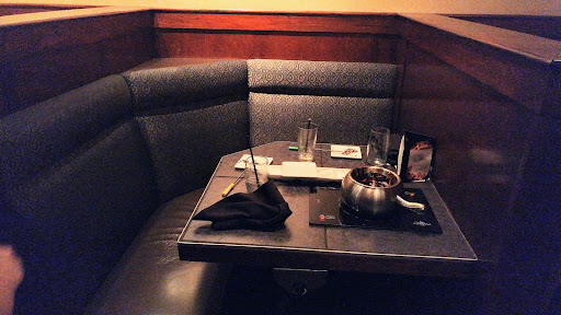 The place is clean, dimly lit, and has many 2 people booths in addition to tables. It seems that 1 fondue pot is for 2 people. Each person gets 2 skewers, and they give each person different colored skewers. We were seated at a 2 person booth.