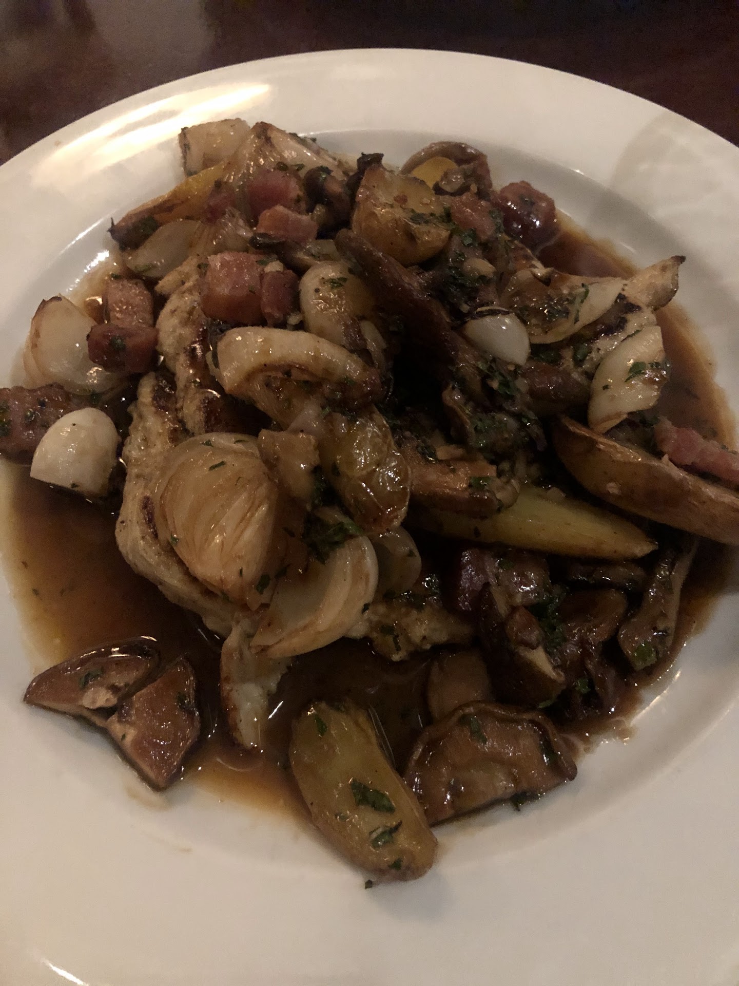 The server made a nice recommendation, Beef Bourgignon. At $27, this was very much a middle of the road item as far as the price point on the menu. The meat was wonderfully slow roasted, and could be pulled apart effortlessly with just a fork and another utensil. The carrots and onions in the dish were cooked perfectly, soft on the inside and firm down the center retaining the integrity of the vegetable, but allowing them long enough to cook to open up the flavor. The type of sauce on the dish I don't remember so I'm just going to go full redneck and call it a light gravy, because well, that's what it tasted like, but much lighter. It was red wine based, and again was a light (gravy) and understated in flavor, but a nice balance to the items on the top of the dish.