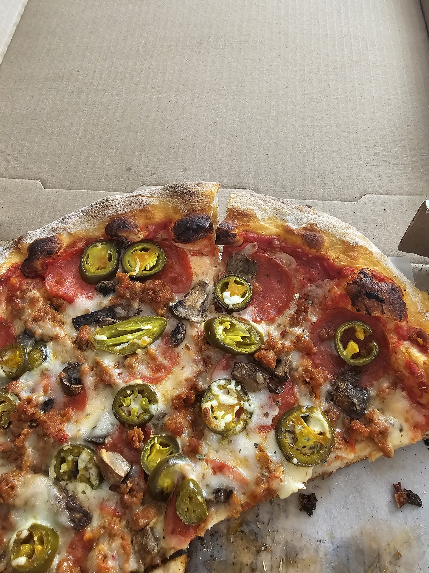 I ordered sausage, pepperoni, mushroom, and cheese sticks with red sauce. The red sauce is a good base but needs way more seasoning - NOT SALT. Garlic powder, oregano, basil, a pinch of sugar, etc. The pizza lacked flavor. It was very basic. The sausage on the pizza should've added flavor but had none. I added my own oregano at home. The pepperoni was put under the cheese, which trapped all the grease and made the pepperoni soggy, not crispy, and the pizza overly greasy.