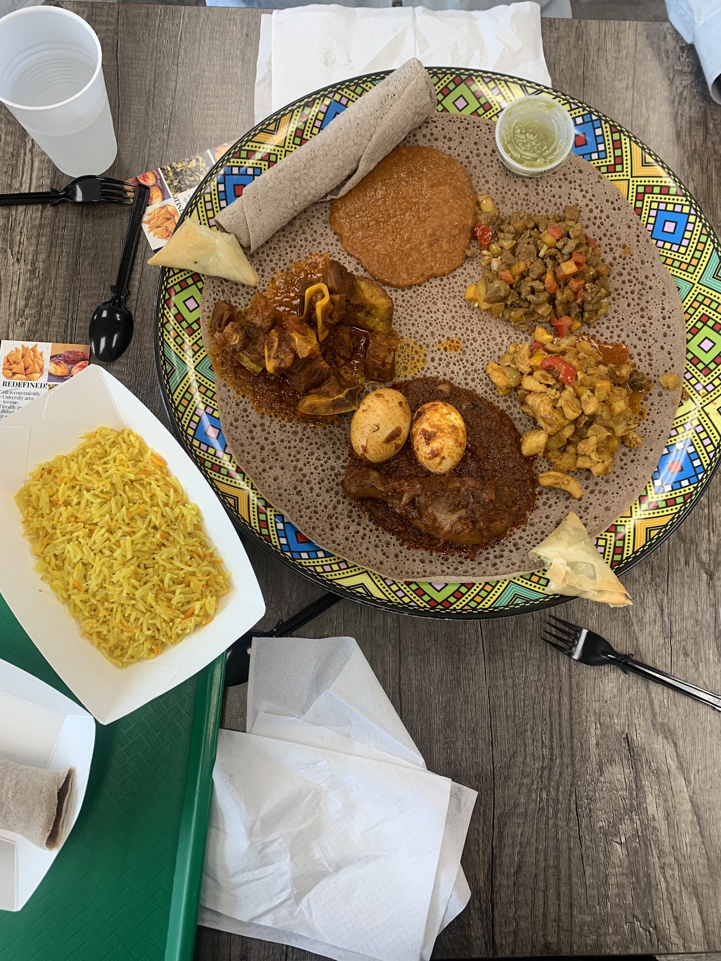 Meals come with injera or rice. I did notice patrons who'd selected rice got large portions of rice, and I got a large helping of injera. The portions of the stews were also large. I got doro wat and beef anchila. I was very pleased by the portion sizes. I was happy to see that each patron got their own boiled egg with their order of doro wat. The taste was phenomenal. The food was good and balanced seasonings with spice. It wasn't too greasy or fatty. The meat was tender enough to be cut with a spoon. The ingredients tasted very fresh. I suspect all the food is prepped and cooked day-of for best flavors.