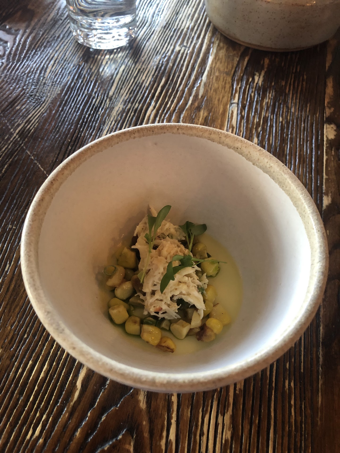 Not on the menu, but received first, was the amuse-bouche of a sweet corn purée and crab. Delicious! And my drink paired well.