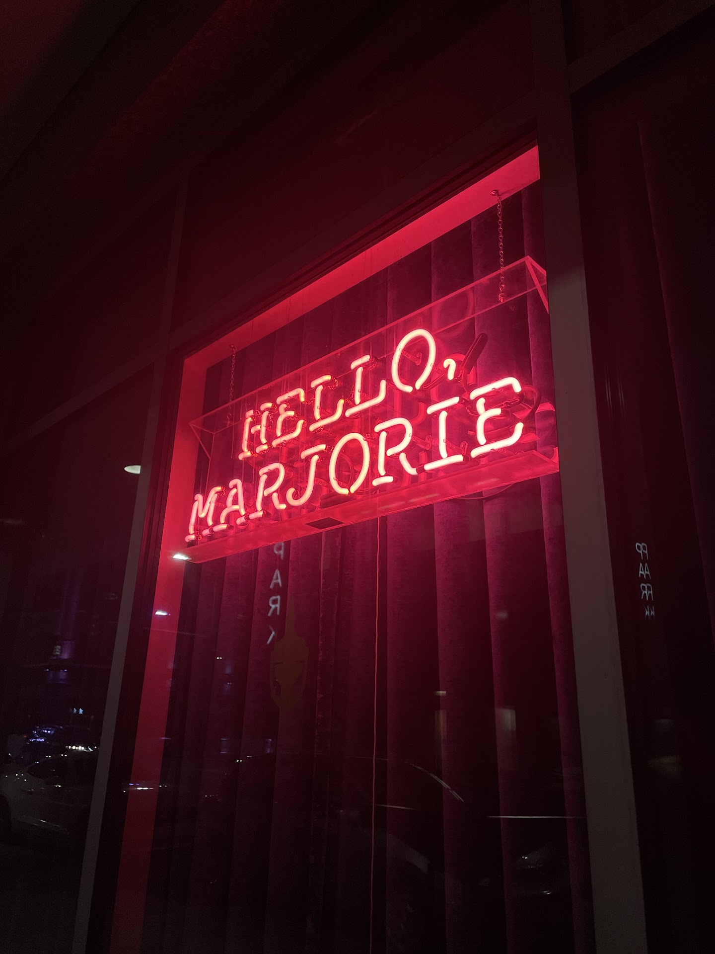 Read moreLet me set the scene.. we were just leaving the Hamilton show close by (highly recommended that btw) and we wanted some drinks to close out the night. We came to Hello, Marjorie and had the BEST time! The vibes and atmosphere is just chefs kiss. We were warmly welcomed when we entered and got a seat. Even asking us about if we went to the show. I was amazed that he even knew. I think our souvenirs gave it away ;) But that’s ok! Our waitress for the night so fun! It could have been the couple of drinks we had or the high of show. But she recommended an amazing drink that complimented my first drink and whoa! This is where I was blown away by the staff.. Last call was made and things were wrapping up. We assured them that we’ll be out soon. Just waiting for our Uber to arrive. They were super understanding and even insisted we wait inside with them until our car arrived instead of waiting along outside. They were even so kind enough so have a male bartender walk us to our car to make sure we made it safely and did end up on the 6am news for 2 missing moms. Wow! Wow! Wow! We laughed, we had the best drinks and we were welcomed from...