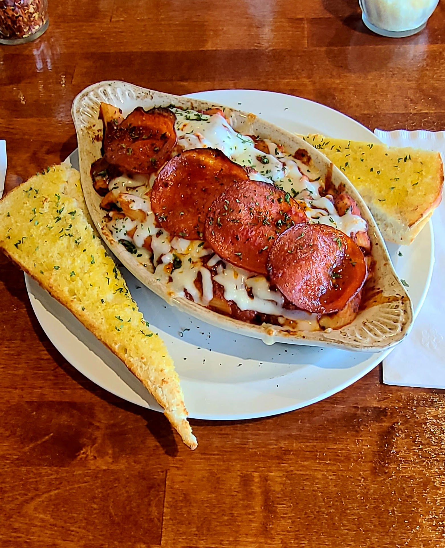 The Bad: Dining area isn't very accommodating for children, so keep that in mind. I didn't see any available highchairs and the majority of seating is counter-height. Not necessarily a horrible thing. Floor was pretty dirty and the seating was pretty beat up. The menu didn't match what was online (sale price per appetizers) and there is no listing for soft drinks. Our server, Joe, messed up our order in two spots: the size of my pizza and the specific sauce my child wanted on her pizza. Appetizer of cheese bread was quite small and it seems likely the appetizers are proportioned to the sale price ($3 of sticker price). We had to wait a slightly long time to be prompted for the check, and I sat and watched our server chat up a table of friends (I assume) and eat food with them for 5 minutes.