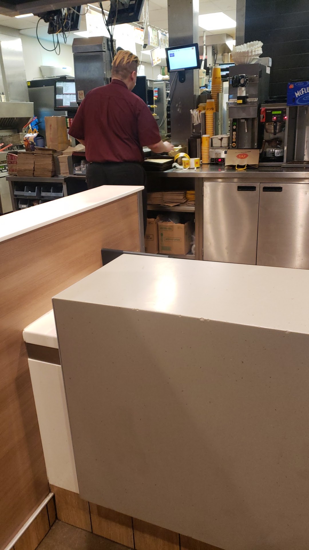 Read moreWorst experience I've ever had at McDonald's! After working my shift I decided to get breakfast and since my window is broken I had to go in. There's a gentleman ahead of me so we both wait for assistance from what looks like the only person running the front. Apparently the lady is "encouraging" customers to use the kiosk. So the lady goes over with the gentleman and runs thru the whole process with him. Then he is paying with cash so he needs to come to the counter regardless. So I order and pay and while I'm doing this she tells me and the gentleman that they are going to do away with the registers and everyone will HAVE to use the kiosk. So I said that I wouldn't come in then. Probably shouldn't have said it but I did. But I'm not the one that's on the clock...she then starts in about how her experience at a local HyVee (I'm still in my uniform) was when she went to eat breakfast there. I asked her how HyVee got brought into it to kinda wake her up at what she was doing with her "customer service"...but that didn't work and she went on and on about it the whole time she was waiting on the gentleman. I just kept looking at her and let her rant. Then she went over and worked on putting hashbrowns in the fryer with no gloves on and not washing her hands. Took some food out and put my bag on the counter in front of me and took a tray out to a table.