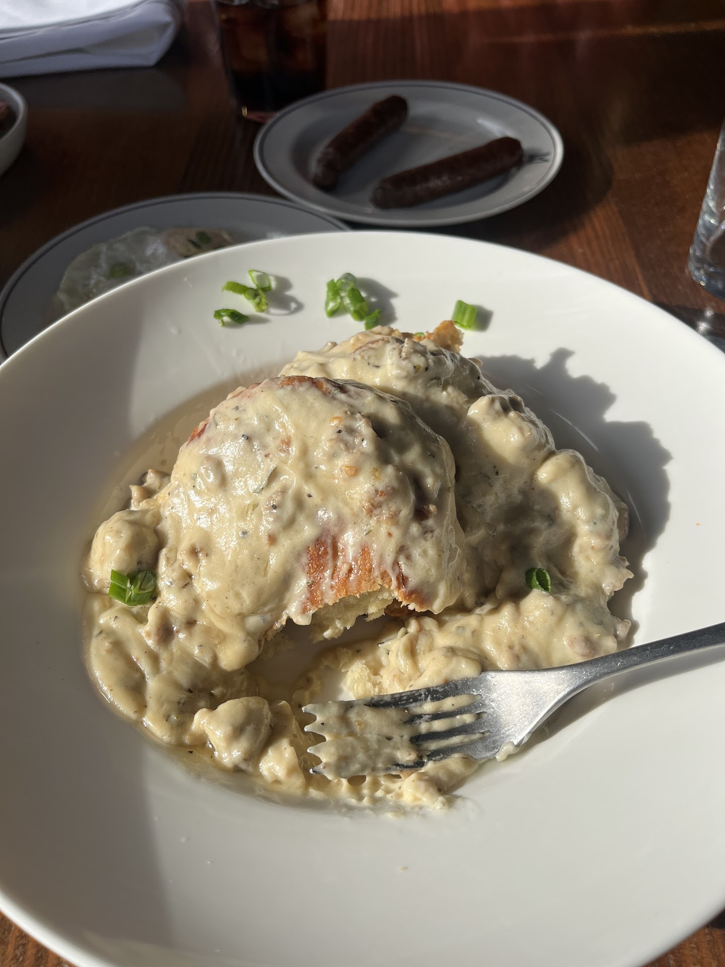 My food was also excellent. We only ate brunch, so I can't speak to the dinner. I ordered the biscuits and gravy and received a massive plate with huge, crispy and chewy biscuits (definitely not a can of Pillsbury) covered in delicious sausage gravy. The dish had some sweet notes (maybe honey) that were very appealing. I highly recommend the dish.