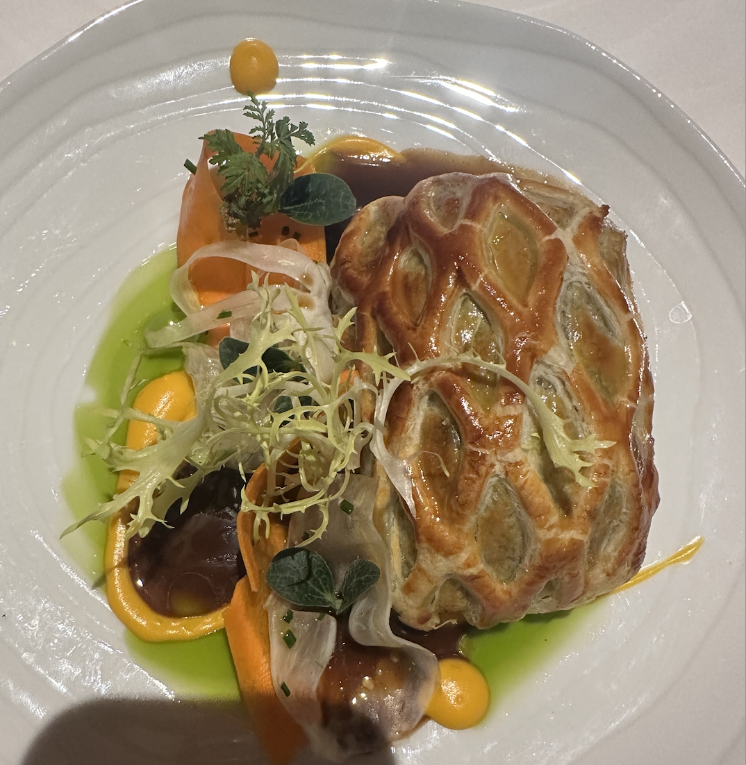 For our entrees, I ordered the carrot Wellington and my husband had the New York Strip with truffle fries. Our waitress told us that the carrot Wellington would make a meat lover into a veggie lover and she wasn't wrong. I'm not exaggerating when I say it was the best entree I've ever had. The crispy and delicate puff pastry, the slow-roasted carrots and mushrooms, the goat cheese filling -- every bite was absolutely incredible. The steak was cooked to perfection (medium rare as requested) and the truffle fries with garlic aioli complemented it perfectly. I have to say though, as amazing as the steak was, the carrot Wellington stole the show in my opinion!