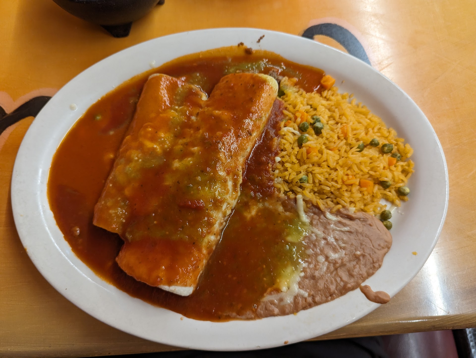 I ordered the #9 combo plate. It was two enchiladas and came with rice and beans. My husband ordered the Burrito Western which also came with rice and beans. We both agreed that the beans were nice and creamy and the only good thing about our food. The chicken in my enchiladas and in my husband’s burrito was completely unseasoned. It tasted like boiled chicken that had been shredded and put into tortillas. It was completely white-bread and unauthentic. Other Mexican restaurants that we love have the chicken seasoned with spices and it has so much flavor. But this chicken was very bland; as was the rice. It had peas and carrots in it, too. What’s up with that? The enchilada sauce that was on top of both of our dishes was also flavorless. It tasted like tomato sauce that came out of a can.