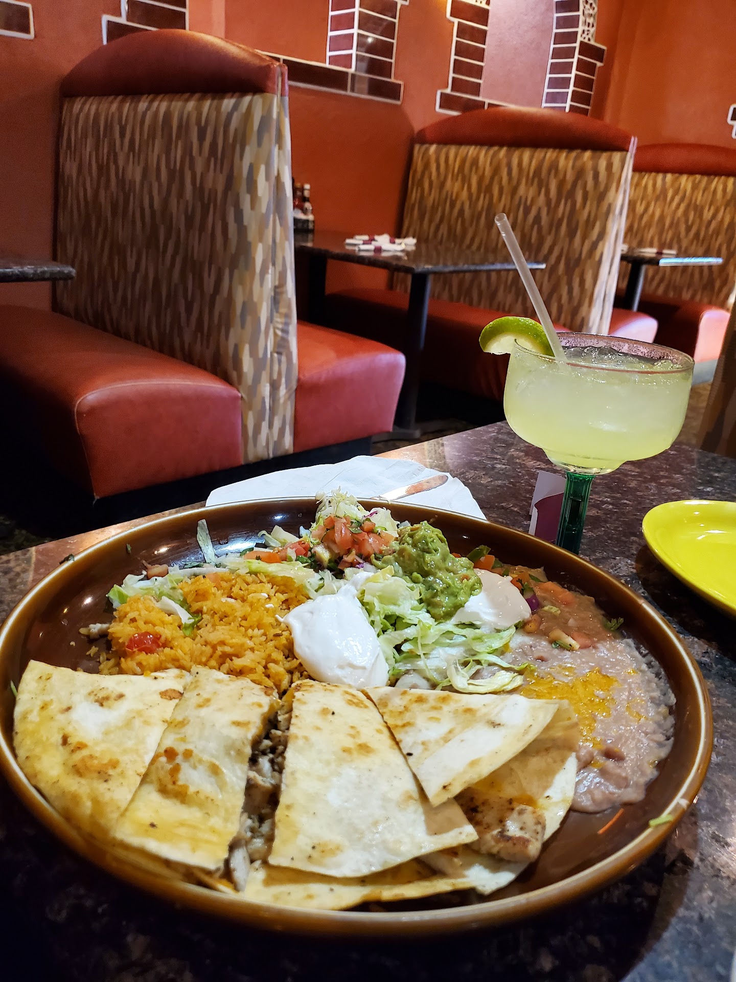 My boyfriend and I visited this restaurant Saturday evening, with another couple. We arrived around 7pm (ish). We were seated promptly, given menu's and the waiter took our drink orders. Several minutes later, we received our drinks, and he took our food orders. The service was decent. I would call it good, but after he delivered our food, we never saw him again, until he brought our check, AFTER my boyfriend went to the kitchen looking for to go boxes. I gave the food a 2. That includes the drinks. I'm being generous. I ordered a lime margarita on the rocks. My boyfriend had the same, only frozen. Short of an at home blender experiment, this was the worst margurita I've ever had. My margarita tasted like Triple Sec and ice water. I'm not sure it even had tequila in it. My boyfriends tasted like a snowcone with sugar water flavoring. The other couple ordered daiquiris. They didn't comment on their drinks. We were brought complimentary chips and salsa. I'm not a fan of spicy. Many Mexican restaurants have very spicy salsa. My boyfriend likes spicy, so it works. The salsa at this place tasted like someone dumped a can of crushed tomatoes into a bowl and added onion. It was watery and it didn't even taste like salsa. The chips were ok, though. This was the unanimous at our table. We both ordered beef chimichanga, ground. This is my usual order at a Mexican restaurant. Chimichangas are seldom spicy, and the white cheese sauce is great. Usually. This was the worst chimichanga I've encountered yet. It had no flavor. Even the cheese sauce tasted flat. It was soggy and tired looking. I suspect it has been microwaved. The spanish rice tasted like rice. No flavor. My boyfriends was the same, hence the to go boxes. The other couple was also disappointed in the food. Though they had other dishes than we had. The restaurant itself is very nice. It's nicely decorated and seems clean. From looking at the reviews, it seems this was a great place to eat at one time. But, it has declined over the years. I hope they get their magic back. But, for now, I...