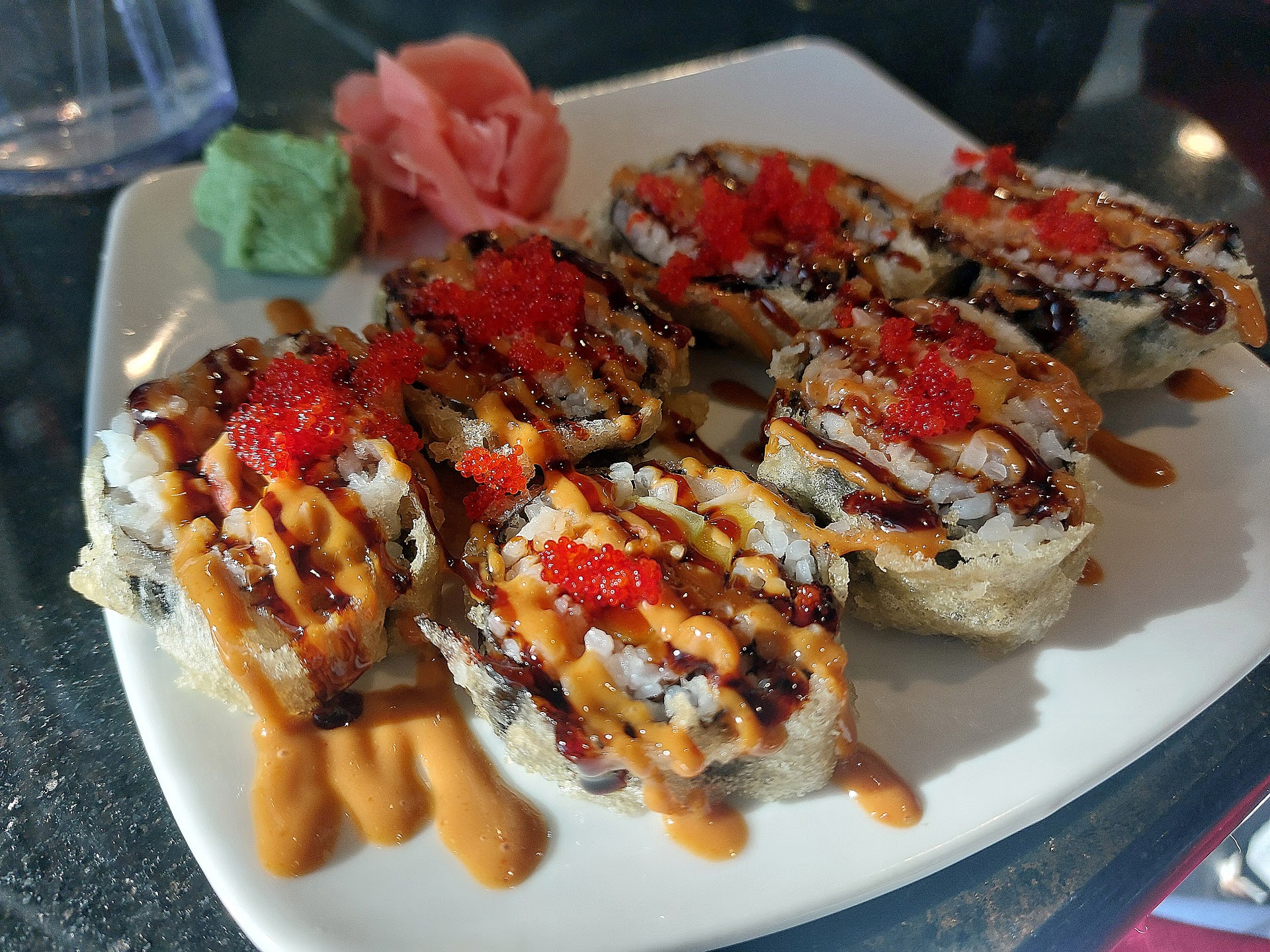 Dynamite: This was amazing. I was a little annoyed because the menu just says it's their best-seller, without stating was it actually is. You choose shrimp or crab (we chose crab), and the meat is surrounded with an abundance of cream cheese, fried up tempura-style, and drizzled with a yummy sauce. It was great, and I highly recommend it.