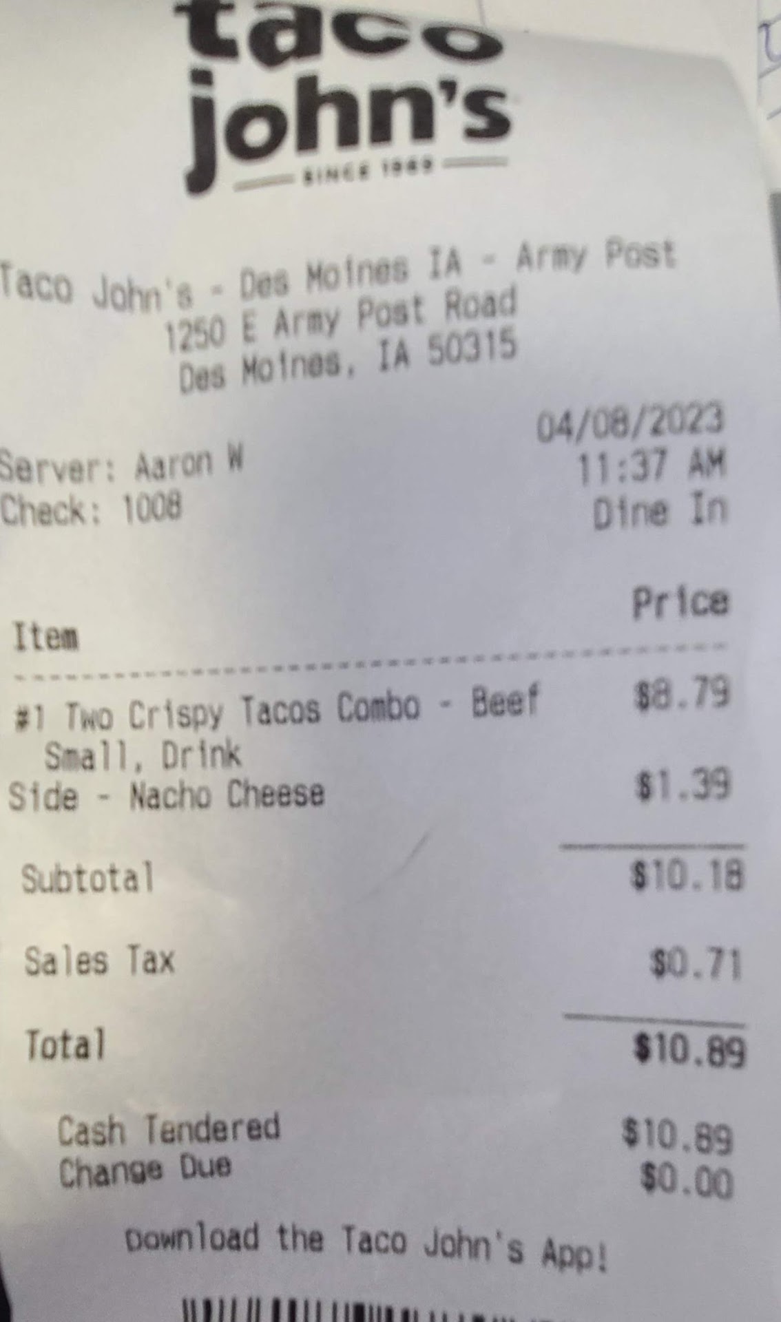 Read moreI enjoy Taco Johns weekly. But the one on SE 14th will lose my business. Ordered a chicken bowl that was under specs and tasted to me spoiled just after 2 bites something was wrong. Replaced it with 3 hard shell tacos and it got worse. Grease dripping out the sides and tasted nasty. The drink station was filthy and they had dinning room like a freezer. On top of all of that the personal issue conversation in the kitchen and counter was outrageous. Im not understanding why this particular store is so bad compared to the others.By the way it was 11:20 am when...