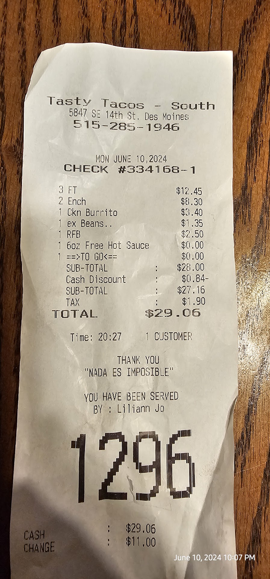 Read moreOrder #1230 Friday 9/5/25 SE 14th 4:58,ordered $45 food take out for 3 as my wife's office downtown orders from another location 14th/Grand,not the location on SE14th. After getting home noticed tacos had 1 table spoon of meat not even covering base of taco shell and a pinch of cheese and a pinch of lettuce mostly eating a doughy taco. Calling manager to address she informed us this is what the owners informed her of how much food to put inside taco. Was informed by wife that E14th /Grand location tacos are filled with much more meat,cheese,lettuce. Avoid this location as you will not get your money's worth. Only guessing Tasty Taco SE 14th is experiencing a higher Trump Tariff than the location E14th/Grand being a different franchise owner 3 miles away. Drive the 3 miles get your money worth,for $45 feeding 3 still hungry and...