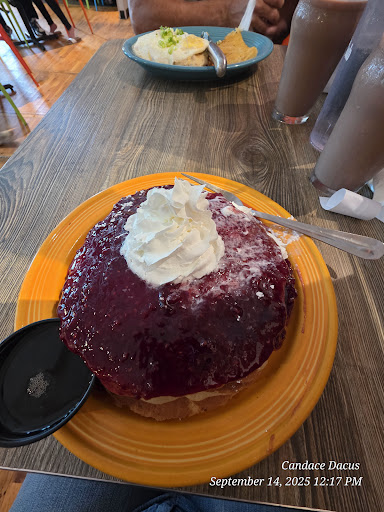 Read moreWe found this place through TikTok, we definitely loved the atmosphere and the paintings. But the staff didn’t match the energy of the building. The table that I was sitting at was still slightly dirty and had crumbs at the corner. I’m not a huge complainer, so I was OK as long as my food wasn’t directly touching the table, the drink menu was pretty surprising and had a lot of options. The breakfast menu had a lot of options as well But I decided to go with brunch and get a burger, and I added an egg on it, which the waiter was accommodating for that. My wife ordered a French toast breakfast, and when we got our food, it was very surprising. it looked like something hospital cafeteria would have came up with. The table next to us ordered steak and eggs and the pad Thai which looked pretty good. Maybe it’s my fault for getting a burger. The food was not really seasoned and the patty was thin definitely not formed in the back, but obviously a frozen patty. The short of it is, if you want to get drunk and eat bar food breakfast come here if you want to enjoy your breakfast and get full then go elsewhere. It would be a fun date spot as long as you bring money. The plate I was going to order was $25. Burger being $13 plus whatever the cost to add an egg is.