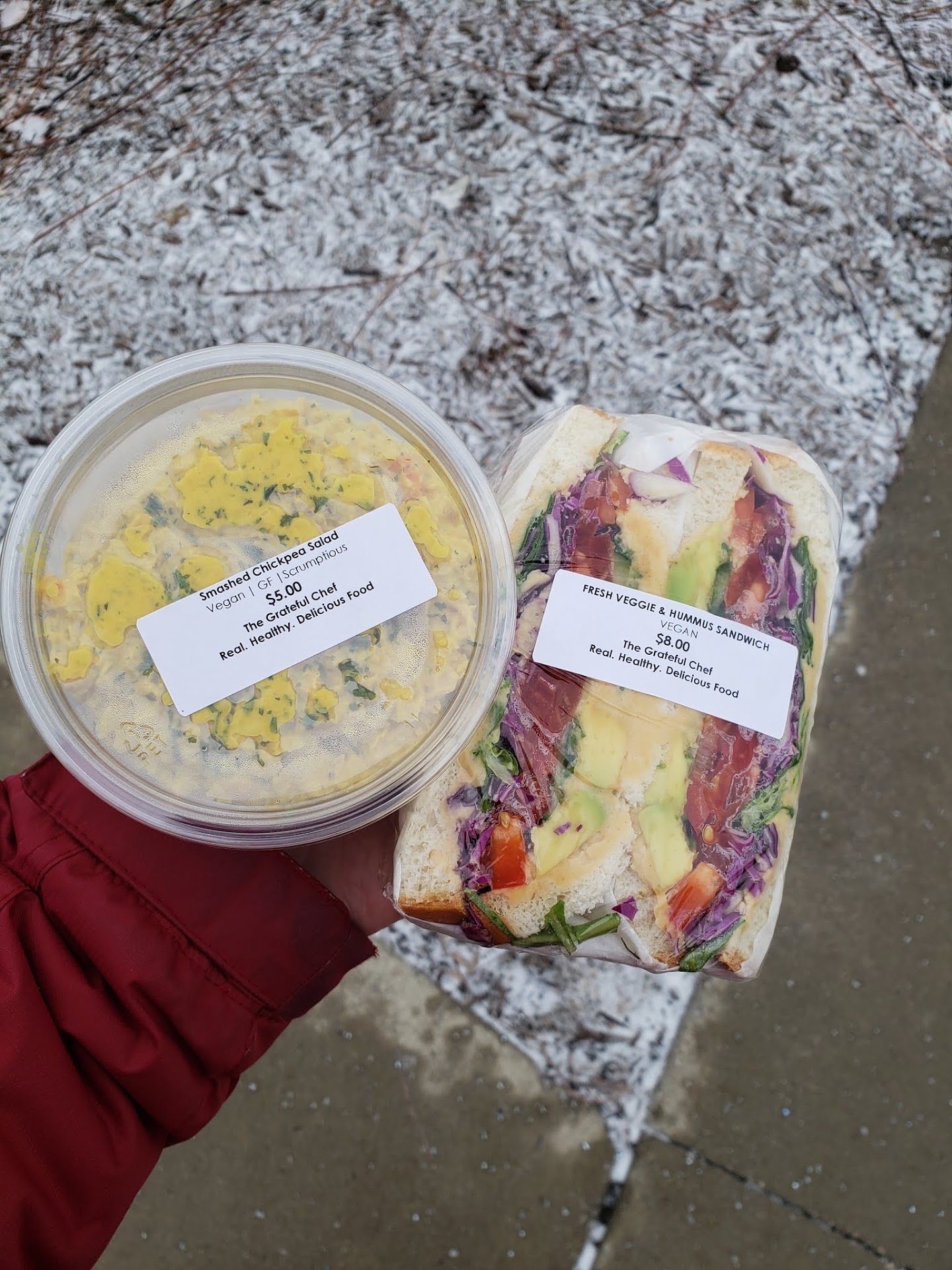 Read moreI visited The Grateful Chef to grab something quick and healthy for lunch recently and was surprised by how unique and wonderful this place is. It seems like more of a location to grab larger, pre-made lunch and dinner meals - there is a giant selection of really creative, delicious sounding meals that need to be taken home and baked off. As for me and my needs, I was wanting something immediate and had a hard time between choosing the grab-n-go options... so I got the two that I wanted most: A fresh veggie and hummus sandwich and a smashed chickpea salad. The sandwich was very fresh, had unique flavors and texture, and was both light and balanced, and the smashed chickpea salad was also exciting with the flavor combinations and texture (red onion, dill pickles, turmeric, mustard). I don't have any allergies and haven't adopted any sort of diet (gluten-free, vegan, etc.), but these options both fell under those categories and I completely loved them both. I am new to Des Moines, and even more new to what the south side has to offer, so this was such a wonderful surprise. I will definitely be back and plan on telling more people about this place - especially friends and family that are looking for exciting vegan &/or gluten...