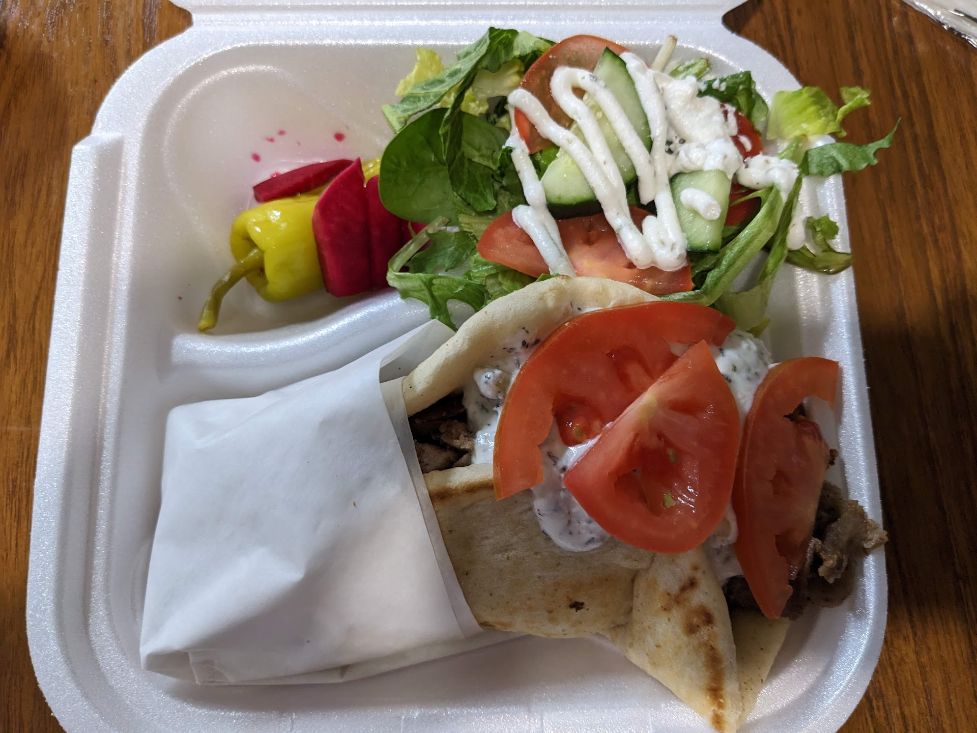 The gyros were fantastic! They gave us each an extra little tub of tzatziki sauce and I used every drop because it is delicious. The gyros were STUFFED full of meat. The meat is very tender and flavorful. The wrap is soft and chewy with a lovely flavor.