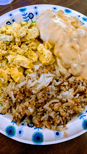 After we sat at one of the round tables the bartender came over to take our drink order (we both got water) and asked, "breakfast?" We looked at one another and then the waitress and said, "yup." Within a minute we had (paper) plates in front of us with biscuits and gravy, scrambled eggs, and hashbrowns. A full plate of food for $5 each.