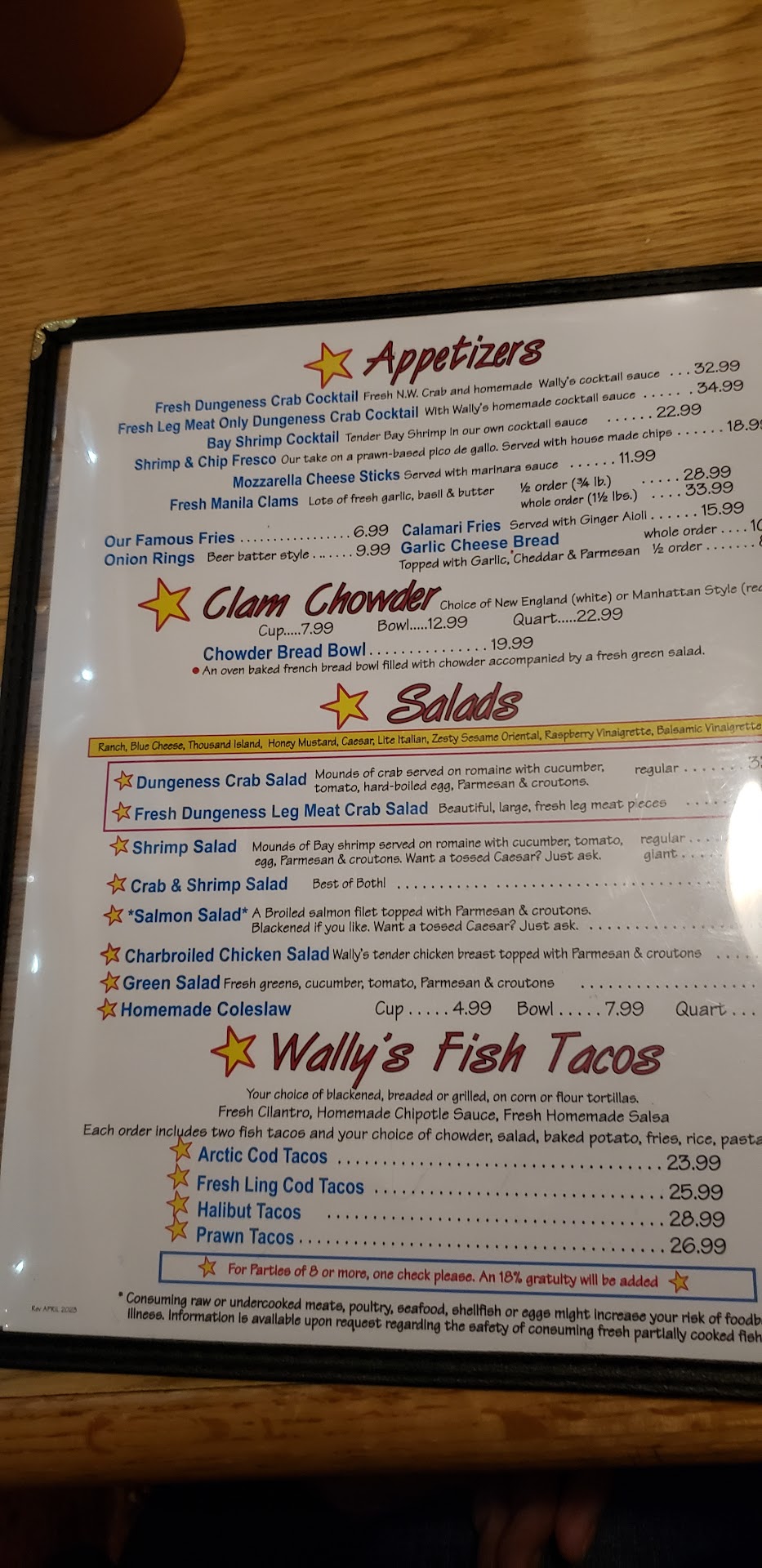 Read moreour kids from Texas were here in Seattle area at the time!!! That is one place they wanted to go with us!!! They lived in Redmond 3 yrs. ago, and had been there before!!!đ The food was super yummy as ever!!! we have been staying OUT of restaurants for the last 3 yrs. because of COVID, but have this last few months have gone inside a VERY FEW restaurants, at way less busier times. We went to Wally's at 11:00 am, opening time, because if you've ever been before it is ALWAYS PACKED OUT! They have several booths and tables besides the VERY LARGE & STOCKED BAR! It is roomier in that section of the place. They also have a roomy, covered outside eating area on the water side ( west of course), with many windows. The prices $$ have gone up considerably. Especially the lobster meal; just under $50 PER PERSON!đ The ALL YOU CAN EAT SHRIMP MEAL is around $30 apiece. We get it because you get chowder with it and YUMMY slaw, VERY LARGE BAKED POTATO with a delightful butter & sour cream mixture, on the side; or French fries, ALL for ALL YOU CAN EAT!!! Ice tea, pop, and (all kinds) of lemonade are refillable!! I guess that's enough of a positive review needed. We definitely RECOMMEND GOING AS SOON AS POSSIBLE. Oh, they DON'T TAKE RESERVATIONS FOR ANY DAY OF THE WEEK& HAVE A VERY SMALL WAITING ROOM INSIDE, BUT A COVERED AREA FOR STANDING IN LINE!!! WE RECOMMEND YOU GET THERE EARLY AND PUT YOUR NAME IN. THEY'D LIKE YOUR WHOLE PARTY TO BE TOGETHER TOO!!! THEY DO TAKE-OUT, AND I THINK, DELIVER, BUT I CAN'T REMEMBER!!! PEOPLE CAN, CHECK IT ON-LINE THEMSELVES. You will have a SUPERB EXPERIENCE!! IF NOT, YOU ARE A VERY...