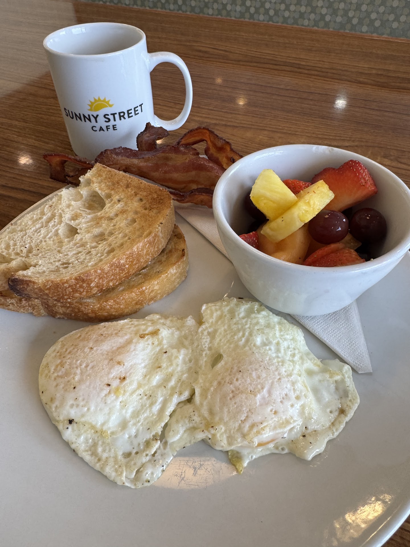 Now on to the food. This place is expensive with mediocre food and small portion sizes (a side of toast is a single slice of bread, for example). The food came out wrong, so overcooked it was just shy of burned and at the same time stone cold.