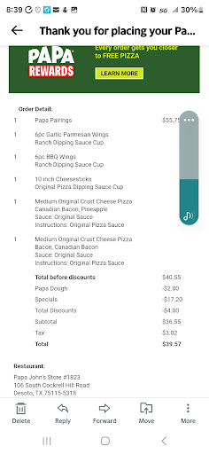 Read moreWell this is the last official time to order from Papa John's Pizza ever. I was reluctant because during the election their was rumor that they were upset over healthcare and would increase their cost per slice or something to that effect. But we broke down and ordered because our senior high school student was hungry for pizza and they were just down the street. So we ordered and we weren't too put off that the order taker seemed to have difficulty asking for the credit card number. Delivery was average and went smooth. But then came the horror- the pizza was hot and nasty. It was awful! We had ordered meat lovers pizza a dozen times in the past and it pretty good. Not better than my favorite, Mr. Jims but edible where most of it was eaten before going into the trash. But this one, this post-election one, awful. It's like maybe it has substitutions for the real stuff you had before. I had one slice and forced myself to finish it and same with my husband and son. We WON'T be going back to order from them. That ceo guy or whoever it is has screwed himself out a customer or customers. It could be horse meat who knows just to get back at his pennies he thinks he lost. These people must remember that they need us to stay in...