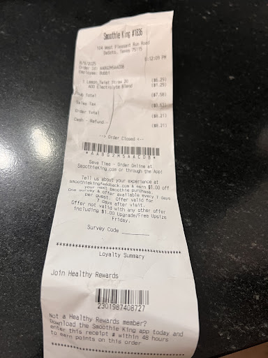 Read moreI had theeee WORST experience with this Smoothie King today! After I called and reported them to Corporate, the manager "Sue," she called herself, kept lying by saying she was calling from Corporate when she called me back. I guess she didn't consider that these phones have caller ID now-a-days; it was Desoto Smoothie King's number. But this particular Smoothie King simply refuses to make my smoothie the way I request it to be made; all that is required to Honor my simple request, is Extra Ice being added to my smoothie to make it THICKER. Instead of obliging my request, on a previous occasion she said that it would break their blenders to add extra ice, and today she says that it is Corporate Policy to NOT add extra ICE. Not to mention, I have gotten one made from here before as requested, but this Manager, for some strange reason, is just wanting to be difficult. (I don't know why my THICKENING of the Smoothie, is a problem for her.) I spoke with someone from the Corporate Customer Service who informed me that this is just NOT the Truth. There is no rule about adding EXTRA ICE. So whoever the Manager is that called me today, pretending to be from Corporate and offering me a FAKE Name, Sue, FAKE Rules, and FAKE Apology you should be ashamed of yourself. The days of "the customer is always right" is a thing of the past. Or even "being sometimes right," or how about simply "getting what you pay for" just has no weight in today's businesses. Smoothie King has lost a DAILY customer over a small request, along with no integrity, lack of kindness, and failure to provide quality customer service. She also tried to tell me that they don't give employee names for the safety of the employees. Again, another LIE, because if I was writing a Positive Review, they would hurry up and provide names. All throughout various Reviews, you see the Names of employees. According to the receipt, Marilyne is the person who rudely took my order. But "Sue" says that it wasn't Marilyne. (Further proving my point that she was NOT calling from Corporate. Only someone physically at the store would have this knowledge.) If you ever go to this one, you will feel/see it more in the Drive-Thru than inside the store, but they are rude, not friendly, short with you, and very dismissive; it's as if they are MAD you came. I am not the one to pay for bad service or lack of service and keep spending my money there. They WIN!! I won't be back.