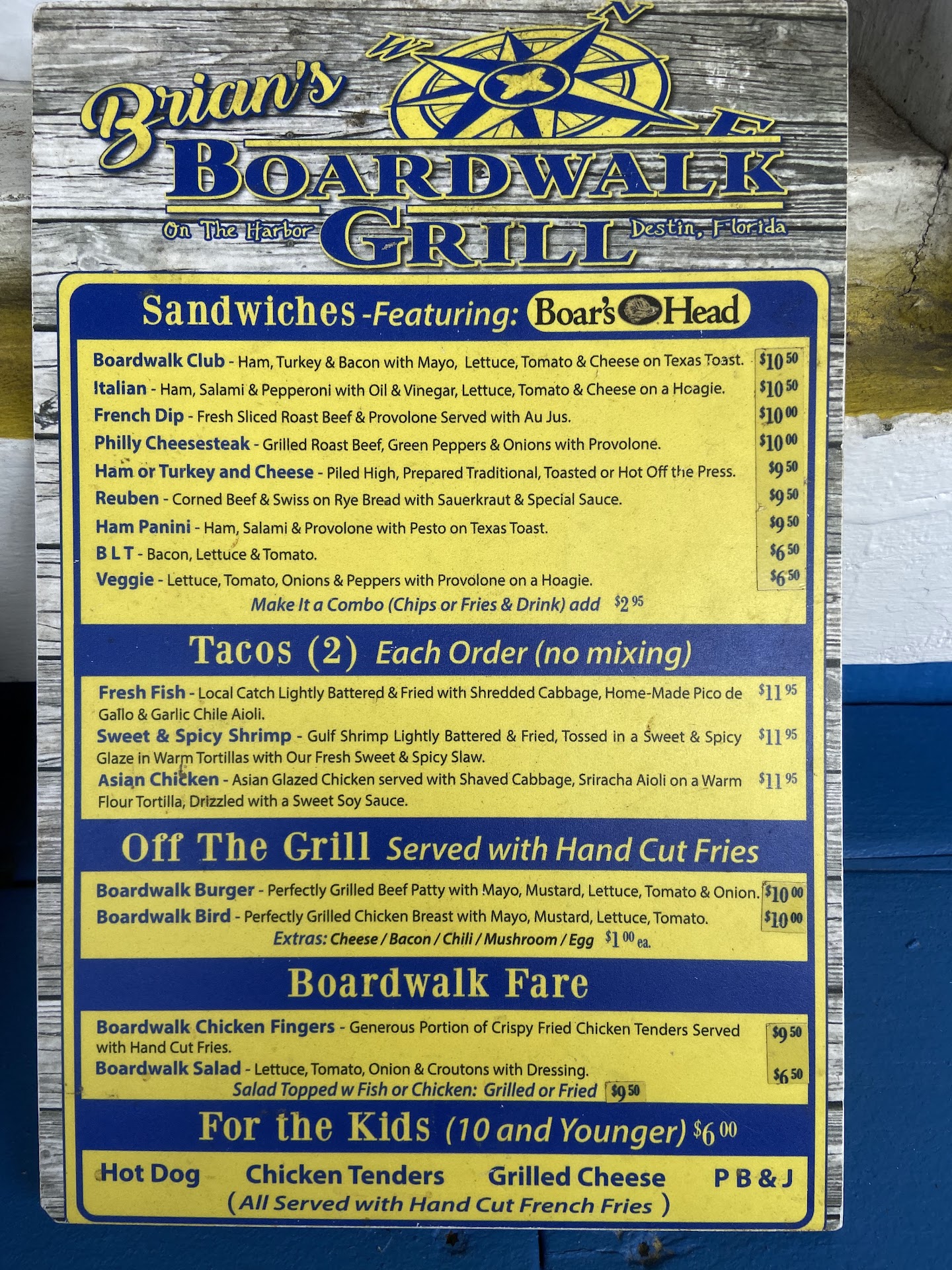 But we paid $10 for parking just to walk down to eat there after reading reviews. The burger is fine. The fish tacos were fine but definitely a let down. The pieces of fish were tiny and very basic fried!!! The tortilla and cabbage slaw was all I could taste. The sauce is decent but could be better. And they aren't huge, I was still hungry after even with the fries. I was thinking this place was going to have some really outstanding well seasoned special hole in the wall fish tacos. I got to only pick out one place to eat out in Destin because of such a short stay. This was the place. And I regret it.
