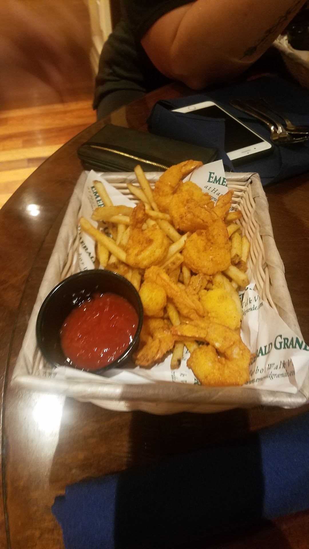 We are locals here for a staycation at Emerald Grand that we purchased at a fundraiser. Part of our package was dinner for 2 with a value up to $100. We could barely use the full gift certificate due to the very reasonable prices. We had filet minion, jumbo shrimp, calamari, and salads. Cortney (our server) was fantastic, great personality, attentive and timely with her service, and made a great Bombay Sapphire dirty martini. The steak was cooked perfectly med rare, blackened shrimp was fantastic and we chose charred Brussel Sprouts and potatoes. Caesar salad was more on the vinegar/oil side (which I like) and the house salad with basil vinaigrette was great as well.