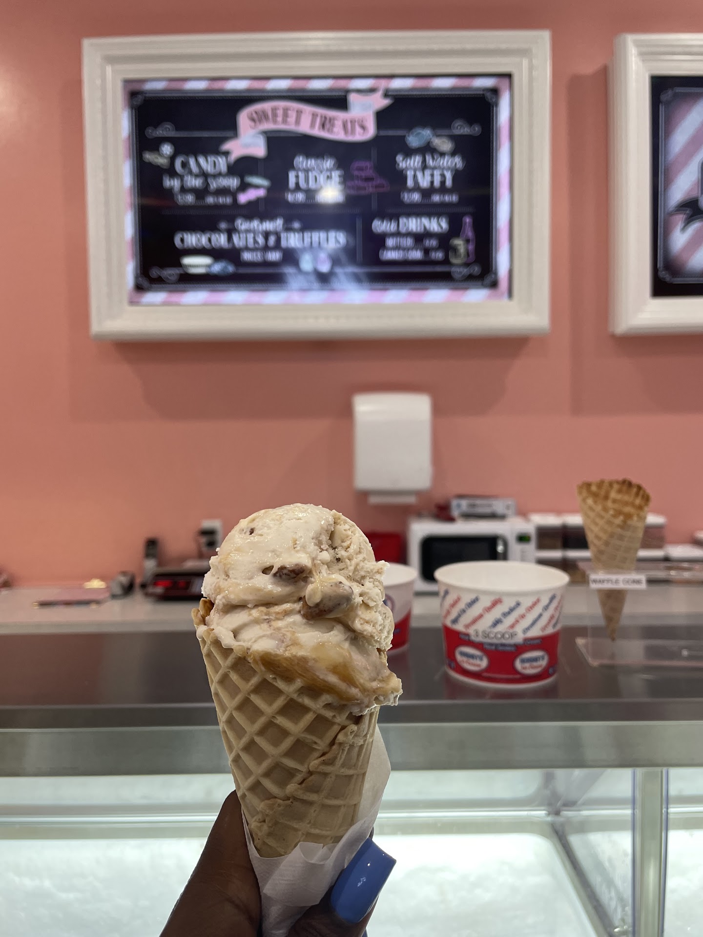We tried the peanut butter pie (single scoop in a waffle cone), classic vanilla (also in a waffle cone), and a double scoop combo of mint moose tracks and chocolate chip cookie doughâevery bite was delicious! The flavors were rich, creamy, and perfectly balanced. The waffle cones were crisp and fresh, making everything that much better.