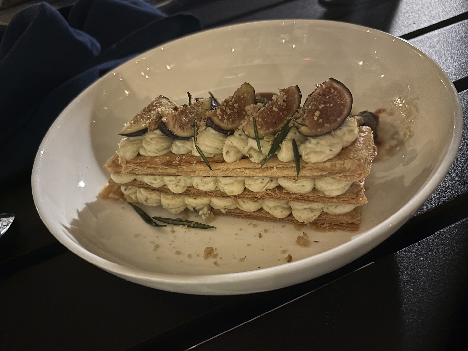 After dessert was offered and I politely declined, somehow my husband talked me into ordering one. I will preface this with the fact that I have been on a low sugar diet for months now and have become pretty disciplined at turning down sweets. This dessert, however, was the pièce de résistance. The fig Mille feuille was something you would expect to see in the finals of The Great British Bakeoff. So elegant and beautiful and one of my favorite desserts I have had in a long while! Even if figs aren’t your bag, trust me, they will be when covered with chantilly cream, flakey, crunchy puff pastry and dipped in the tangy accompanied sauce. This was hands down worth me having to take another 3 days to get back into ketosis and I do not say that lightly.