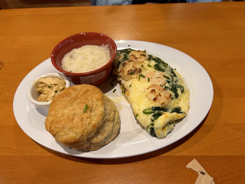 On this occasion, the breakfast selected was just an omelet. The kitchen was able to substitute spinach for the onions and peppers (there was an extra charge for the change). The omelet was cooked as it should have been but was greasy, detracting from the appearance and quality. The biscuit that accompanied the omelet tasted good. It was heavy rather than light and fluffy as biscuits are sometimes prepared.