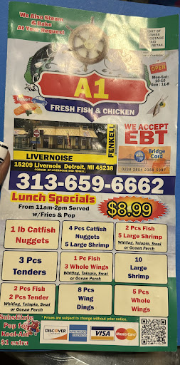 Read moreClean establishment. VERY pleasant customer service. GREAT tasting and fresh American Catfish! most importantly I appreciate their willingness to accept a call-in order within 30 minutes of their closing time. So many restaurants refuse to service their customers this way and miss out on additional money, and express attitudes when we are trying to give them our hard earned money. A1 is the complete opposite. I will definitely be back and have already referred 5 other...