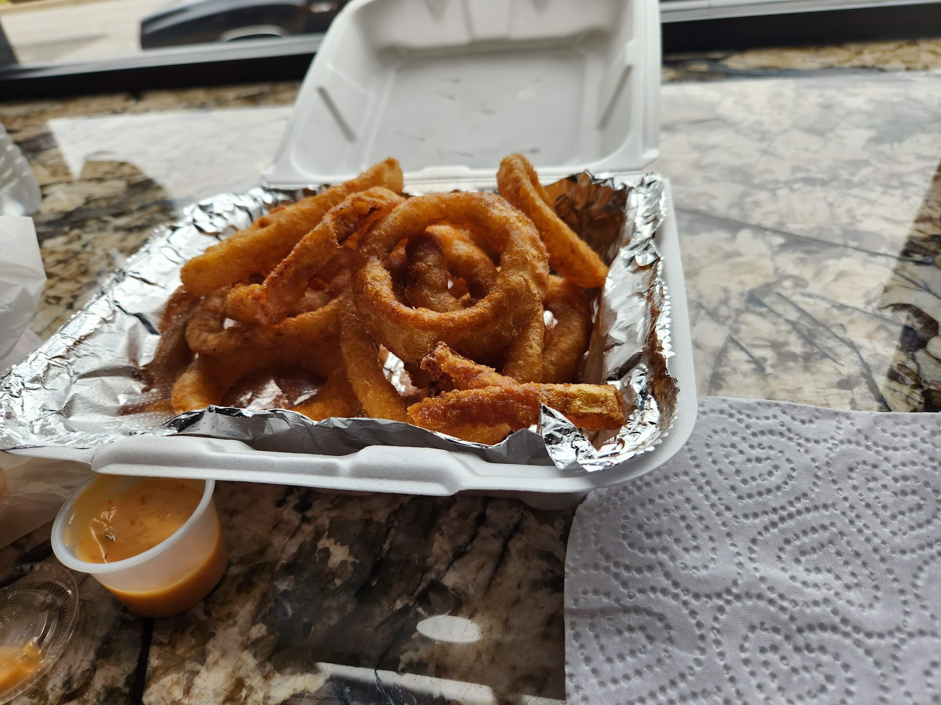 The cheeseburger egg rolls were stuffed with mostly a lot of really dry ground beef, tiny bit of cheese, tiny bit of pickles/onions. Not the greatest. But the sauce kinda(?) saved it. Steak cheese & pepper egg rolls had no cheese in them to be found - again, mostly just dry meat. Part of me wonders if they ran out of cheese, too and just didn't tell us. Didn't end up eating the corned beef egg roll - was saving it for leftovers but ultimately tossed it cuz the wife's stomach was doing flips shortly after we got home and we didn't wanna risk it.