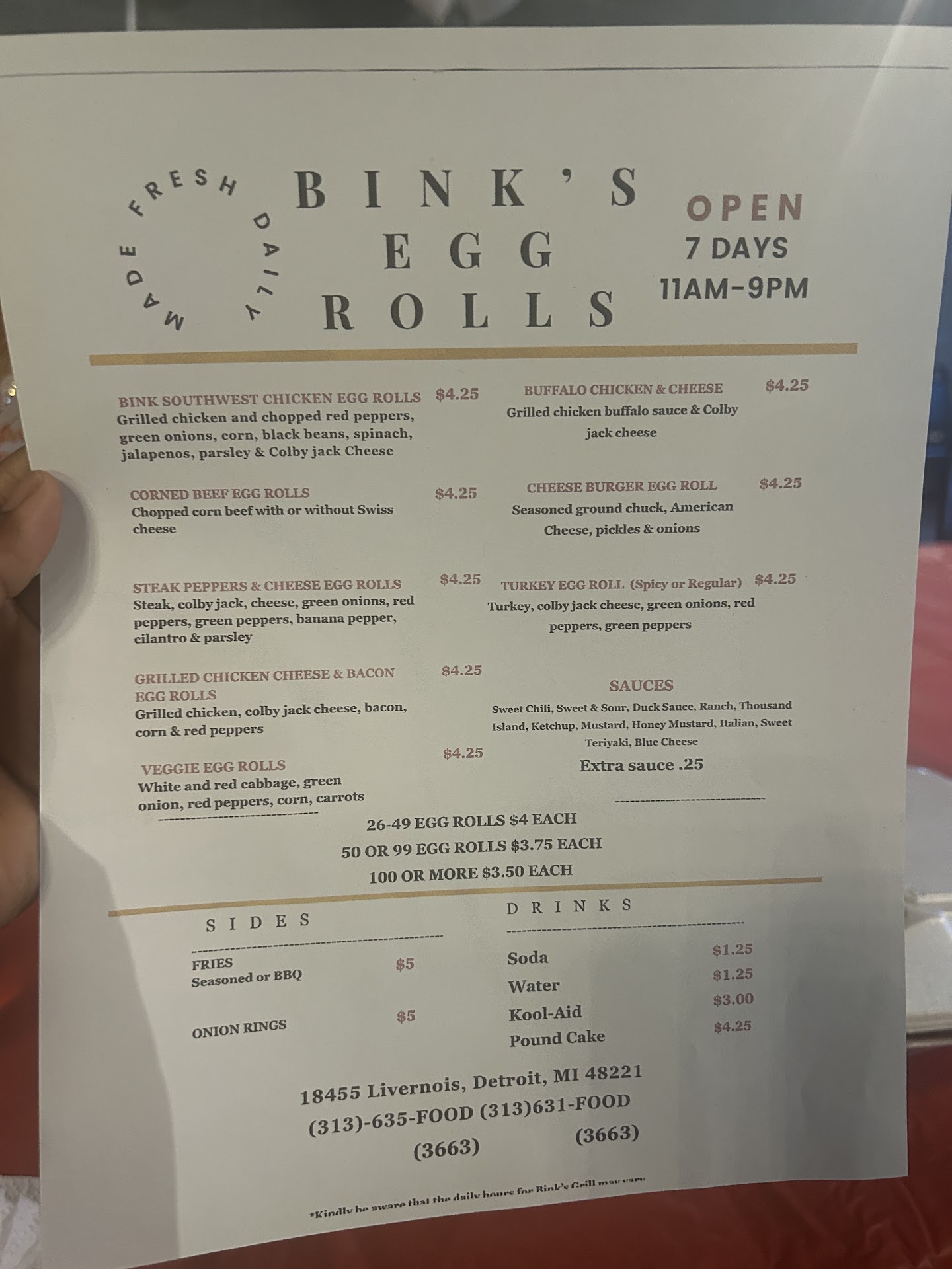 Read moreToday was my first time trying this spot. I was told 15 minutes for my order to be ready. I got there and I waited outside for 20 minutes went inside and had to wait 30. He comped me a drink for the long wait but Whoopty Doo my food was still wrong. I ordered three veggie eggrolls, three steak two southwest and one turkey. But end up getting no steak all southwest chicken and two veggie egg rolls and one turkey is hard Next time I’ll check my food because you have to bite into the eggroll to know what you got honestly Which sucks other than that the food was OK. The southwest eggroll were OK. They just need a little less heat. The veggie eggrolls were very bland and I thought it was just white and red cabbage. I did not know they added corn to the veggie eggrolls. I thought that was weird but OK and I got an order of the seasoned fries, which were not really seasoned very well so don’t know if I’ll return...