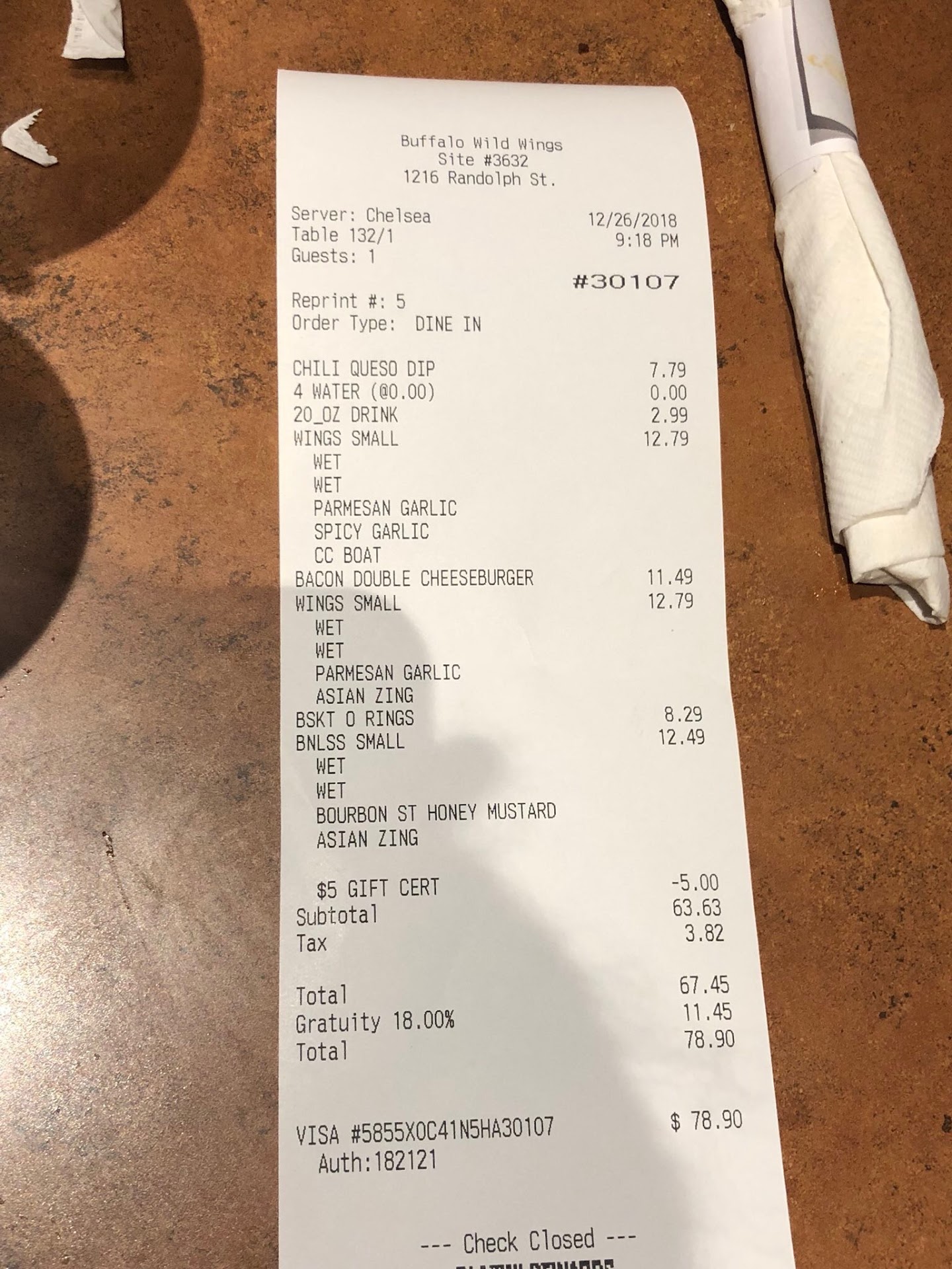 Read moreHad order to go. Asked if all condiments/salsa were included. Ensured included. Once miles away, verified salsa was not included for chips. Called this franchise to have the “boy” argue w/ me saying salsa isn’t included with chips, unless you order at an additional charge. I say “boy” because a man would not speak so rudely & provide the most distasteful customer service I’ve ever experienced in food service. Asked to speak to manager or would call corporate. Put me on hold w/ no manager ever picking up. To contact corporate BWW, what a JOKE! Totally not user friendly to ensure they won’t have to deal w/ it! Shame on you BWW! No wonder staff in franchised restraints have misappropriate behaviors, no communication skills. Not to mention expectations of customer service & class. Would not have cared, wanted just to make aware as we were unable to return, but with the horrific way I was spoke to created a simple …. Would have been nothing to an irate customer that refuses to let it go!!!great location for venues, but doesn’t mean customs will patronize. Teach phone etiquette to staff. It’s not txt customers hear this sarcastic tone not to mention, his nauseating lie that salsa isn’t included!!! STAY AWAY, the “Big D” have too many very nice eatery’s with fabulous professional staff to deal with this!!! To ask these questions below …. After such an inappropriate encounter. What does it matter amount spent? More proof of poor etiquette at not only local...