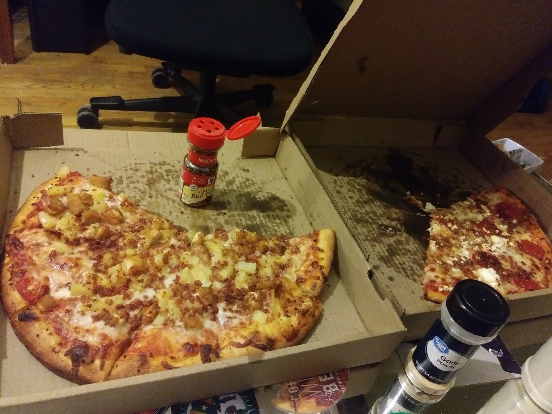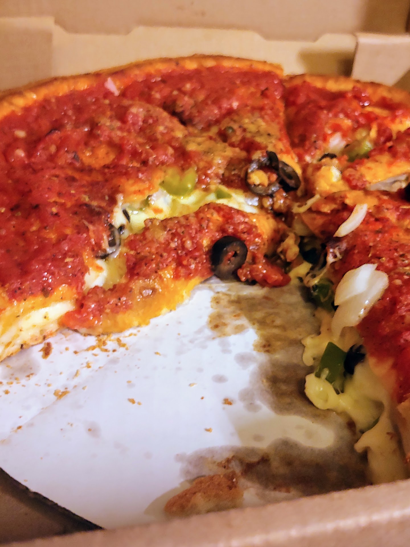 Just finished eating this pizza, and it was pretty good. Maybe a little light on the sauce, but the cheese, toppings, and crust were all good. We ordered through DoorDash and the food arrived hot and 10 min early. We got the Double Deal, two medium 3-topping pizzas for $14.99 (plus tax & delivery). I wasn't sure if they would be deep dish, but they were not. Each pizza was 10 slices, pretty large for a medium! Plenty of toppings. The crust was pretty thin and crispy. I don't usually eat the crust, but this was so good, I ate most of it. Also, DoorDash only lets you choose 3 toppings for both pizzas, but I called and they said you can order 2 different pizzas, just leave it in the special instructions. We got one with pepperoni, bacon & feta, and another with chicken, bacon, and pineapple. The chicken was cut up fried chicken! I've never seen that before, but it was really good! Oh, and the pizzas arrived shrink-wrapped together. Never seen that before either, maybe it helped keep...