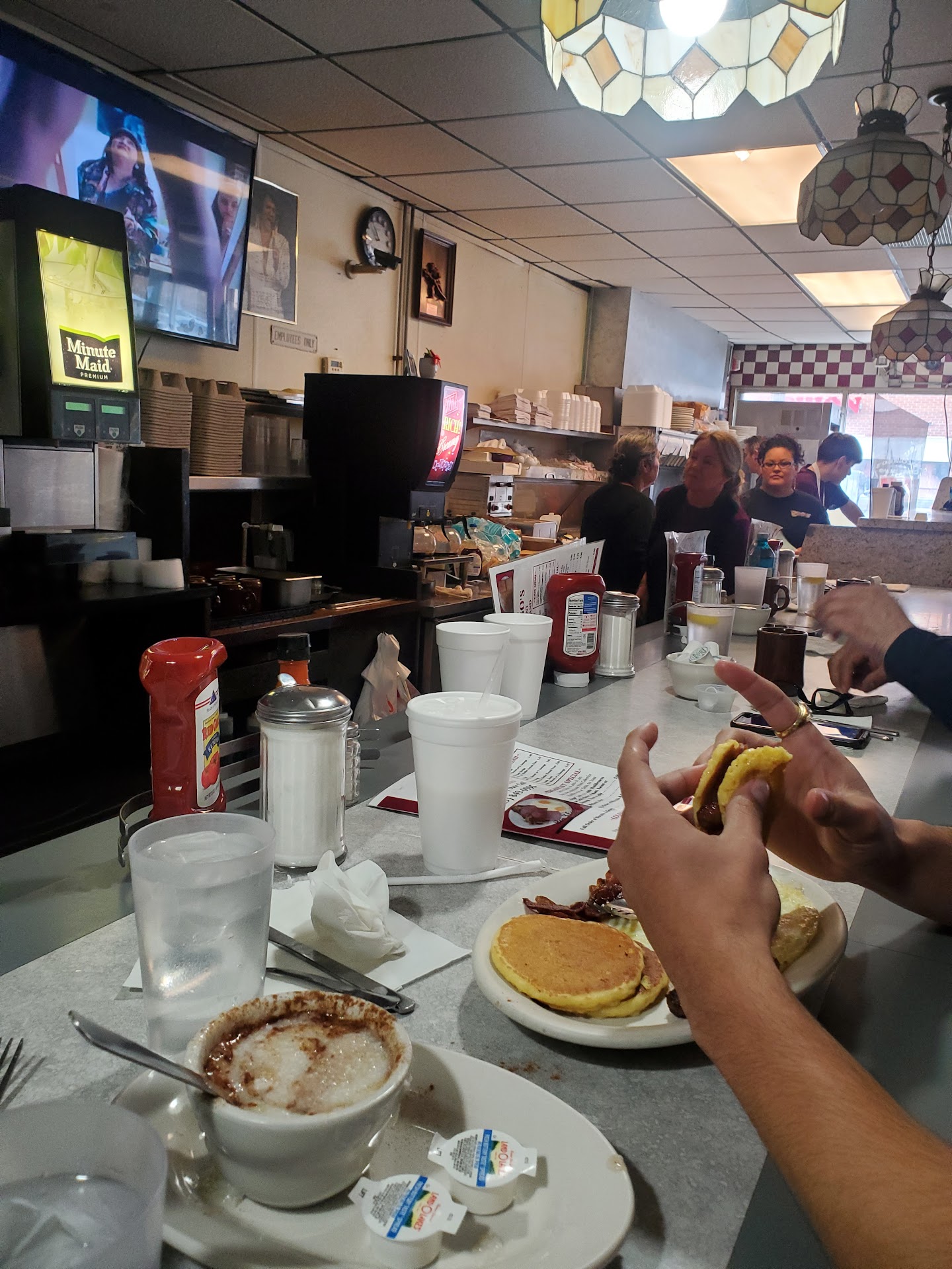 I've been going to this place for years , it always had pretty good food. My last visit was my first in about 2 years. I primarily get breakfast and occasionally lunch. This visit was a breakfast visit and I had my 16 year old son with me, a pancake critic. Lol He never has tried these so I figured he would have a good experience. I ordered an omlette breakfast , they have always been really good, he ordered pancakes and eggs. The girl waiting on us was more attentive to her phone than to us or any of her other customers. So after at time the breakfast was ready and brought to us, thrown on the table as if we were bothering her. My son gets his and says to her I ordered the regular pancakes not the kids. There were 4 silver dollar type pancakes on the plate, she goes "that all we have". Mind you that anywhere else 3 full pan size pancakes are about 6 and change on average. So I says to her , so 4 very small silver dollar pancakes cost $5.70? Yup, I said I'm glad he ordered eggs and bacon because that's not even enough for a kid. She gave me a dirty look and went on to forget my toast and the other drink my son requested. So needless to say the experience was lack luster at best , bad service, rude waitress, expensive food and left hungry on my sons part. My omlette was pretty good they didn't give me very much hashbrowns and didn't cook them well done as I requested . I don't think I will be back there any time soon and my son says he's never going back, they received an"F" from his point system. I told him next time will go to Dulys up the street, a far better establishment of delicatable...