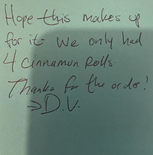 Read moreI went through Uber eats and got six cinnamon rolls and one sprinkle donuts. They didn’t end up having two of the cinnamon rolls so they sent me this kind letter, and when I opened it, it was four powdered donuts filled with some type of goodness 😂 , two glazed twist donuts a chocolate brownie an another glazed donut with chocolate frosting on top, and I also got an extra sprinkle doughnut, so for the, not having the two cinnamon rolls I ended up with nine extra donuts, I’m kind of upset because I didn’t get a picture of the lovely donuts that I received, as well as the cinnamon rolls but I am extremely thankful and I am so happy. Thank you so much Donut Villa you are wonderful.!!! Your donuts are extremely delicious!!🥰🥰...