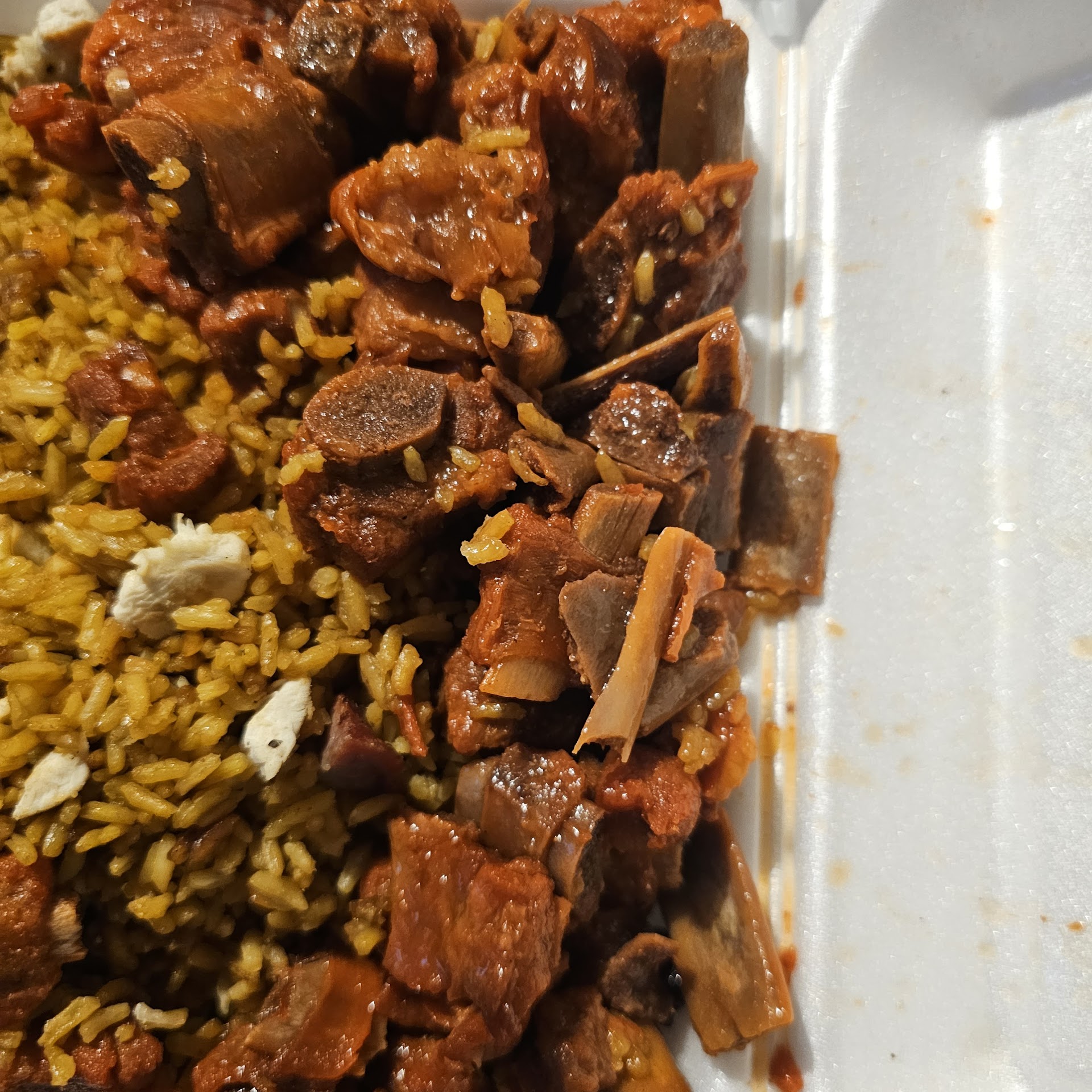 To owner: If it is unavoidable that meat fall of the bones... why all my ribs where 10-15% meat and rest bones? Also part of the rice was hard like burnt rice that stick to the pan. And the ma'am you talking about was the person who bought the food yesterday and she is my wife. I buy food from you guys almost daily since I work in security very close but this made me rethink about buying more food in the future. After 3 calls to doordash they refunded part of the money to her, but driving 15 minutes to get a refund and driving 15 more minutes to get home is half an hour. And after worked 12hr that day I didnt wanted to drive again and even less go out. Please check quality of food because I am not the only one complaining here on...