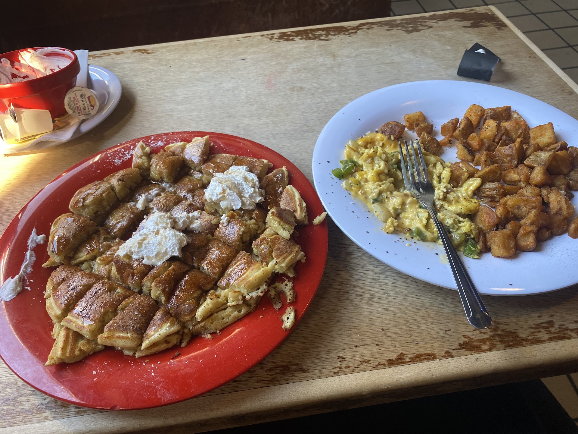 Took forever for our waitress to come take our order. Someone else brought 2 of the 3 cocktails and we had to ask someone else to bring the other one after 10 min passed. 25 min after ordering someone came to tell us one of the dishes (corn beef hash) was sold out so our friend ordered something else ( a BLT). The food came in waves and one person ordered chili fries no cheese and cheeses was in it. She sent it back and got what she ordered. All of a sudden all plates were served and the one that ordered the corn beef hash and had to order something else was served her corn beef hash. Surprised with that. We werenât checked on. Had to flag down the waitress for water refill. There was no butter on the table or offered for the toast and waffles. We couldnât ask for it because hardly anyone served the table. Upon leaving, we noticed all the other tables were provided butter.