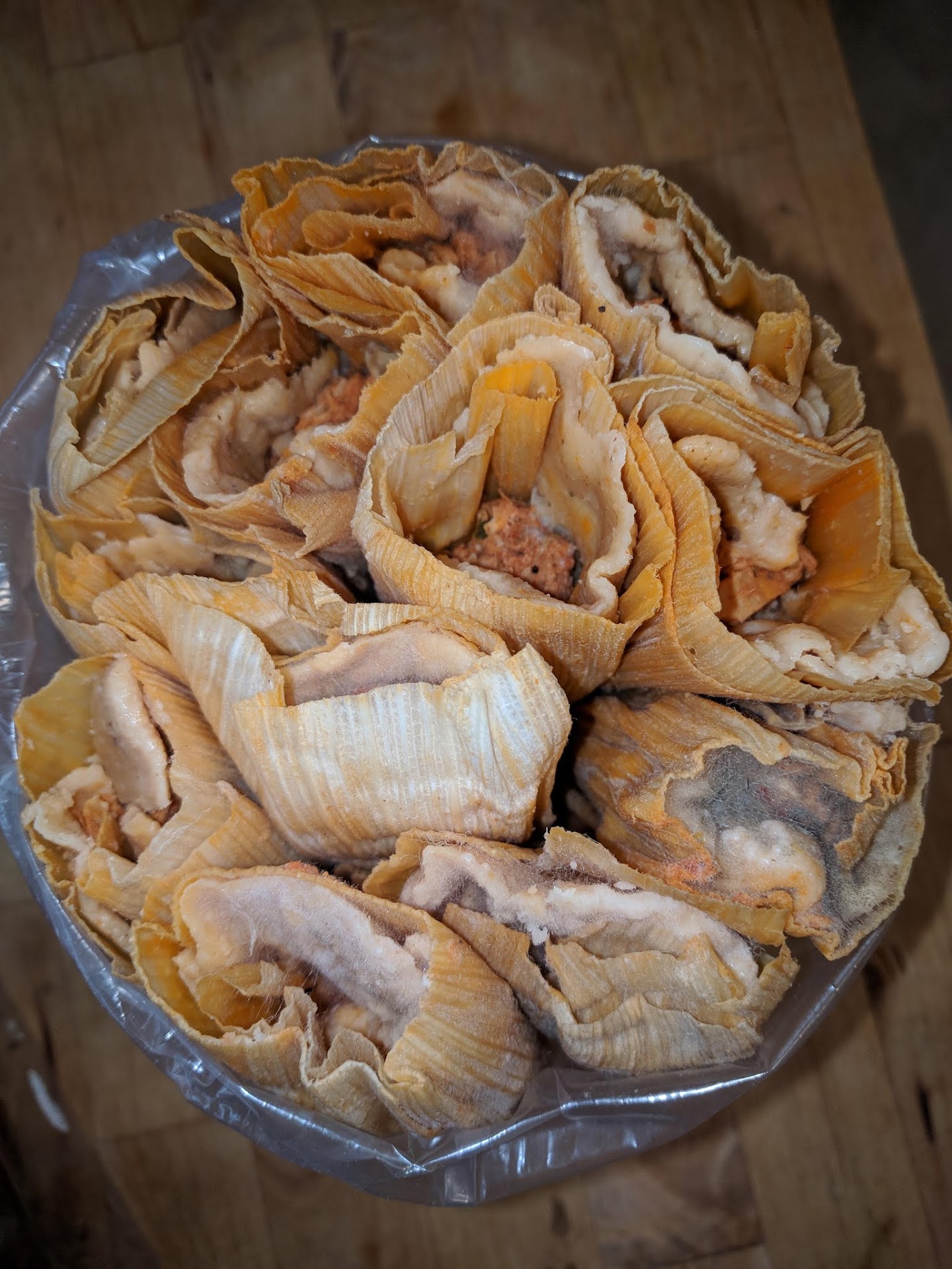MOLDY. TAMALES. That should be all I need to say, but I'll say it again for those of you in the back: THE TAMALES WERE MOLDY. They sold me MOLDY FOOD. In fact, there were three kinds of mold growing on them: the fluffy gray/white one at the tops (the open ends), the thicker gray one underneath that, and the very dense green-black one growing on the inside (visible through the corn-husk wrapper).