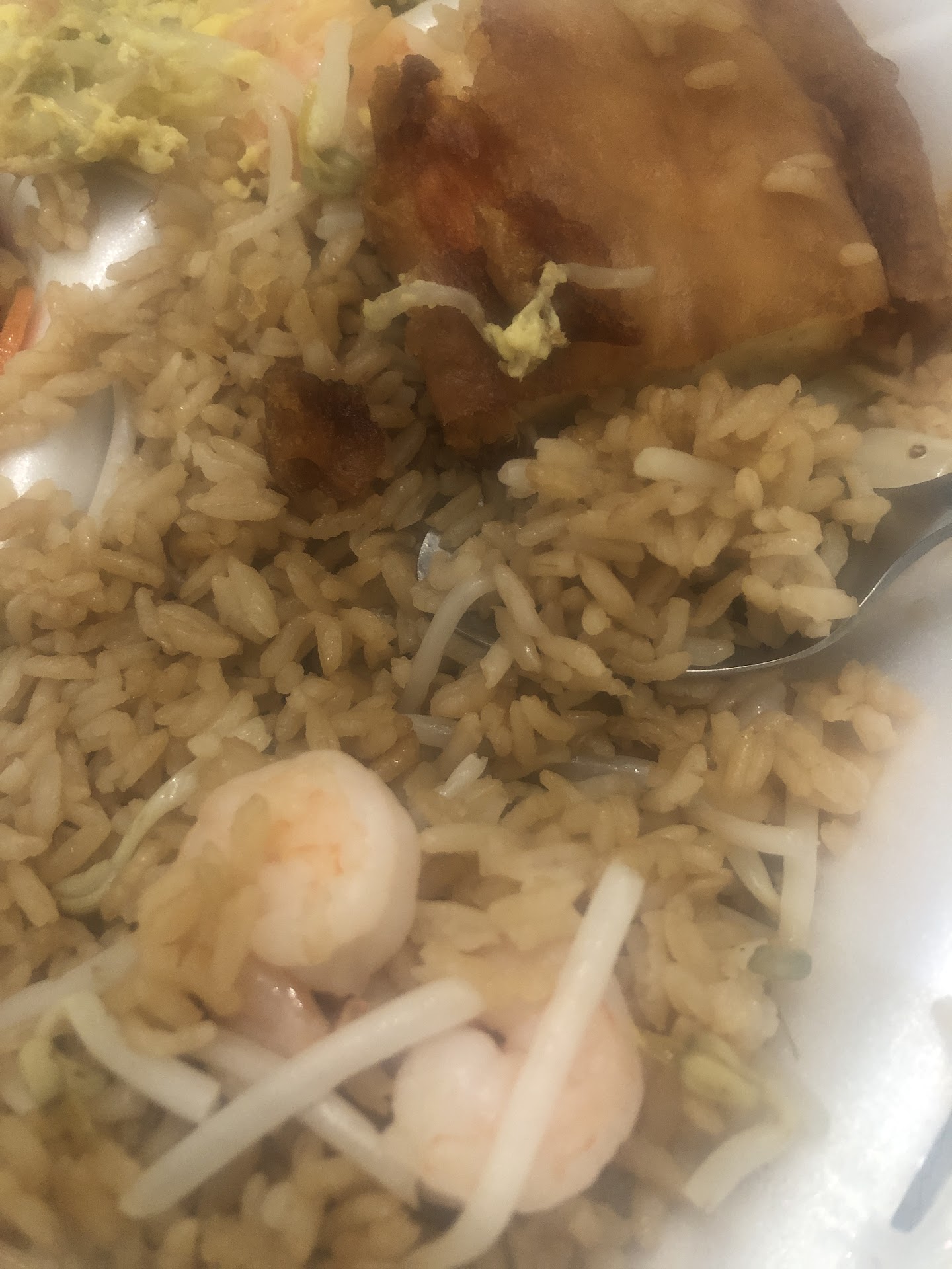 The shrimp fried rice was not fried. It is clearly steamed rice. The shrimp was placed on top of the rice in a pile, and it is slimy and NOT the right texture. It was also not fried and the rice is bland because the shrimp and other ingredients are not made in a wok together as would be expected and advertised. The bean sprouts are pale and also not fried as are the onions.Do not charge people for fried rice if it’s steamed, they can just get the white rice at that point.Egg foo yung was decent. Almond chicken was a little over cooked but decent. Basically, they are not even trying anymore. I predict a closure in 1 year. Drive to the suburbs where they respect themselves and customers enough to turn on the fire...